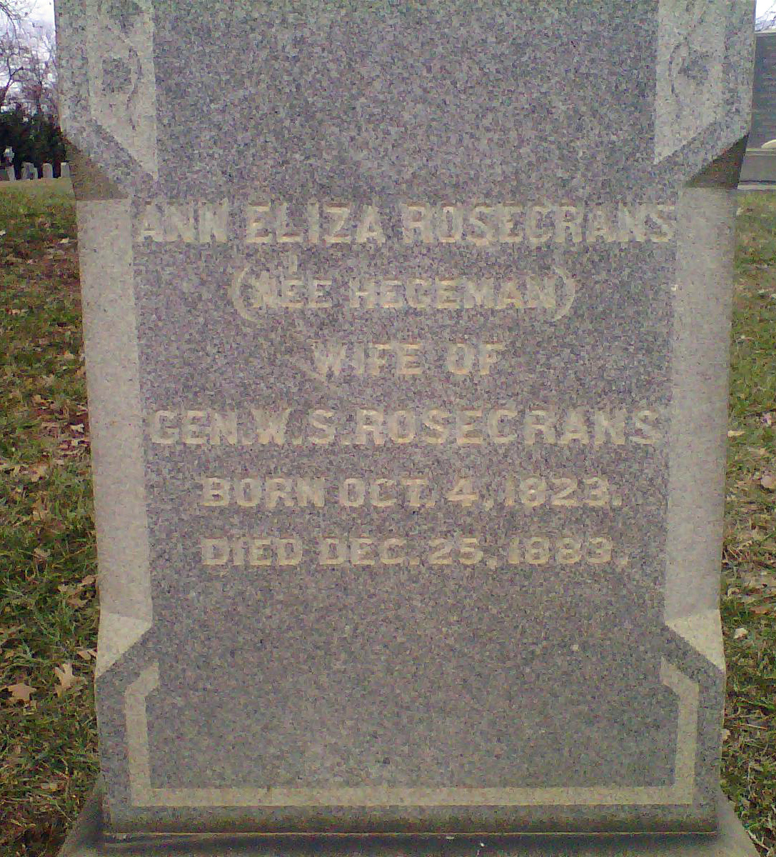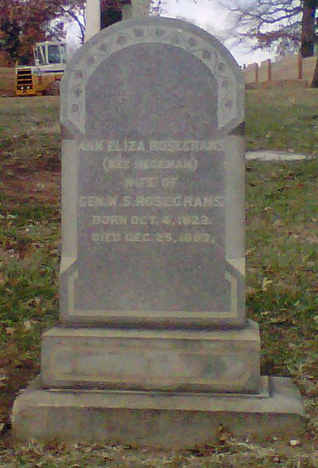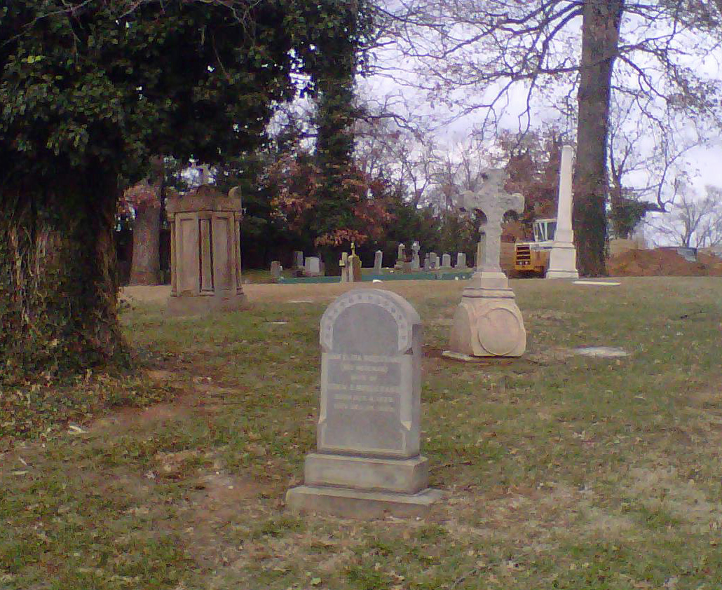 Mount Olivet Cemetery in Washington D.C. Ann Eliza Rosecrans is marked with the grey marker in the foreground. The sand block marker to the left is James Hoban, architect of the White House. The tall white obelisk second to the right is Lt. Col. Julius Garesché. |