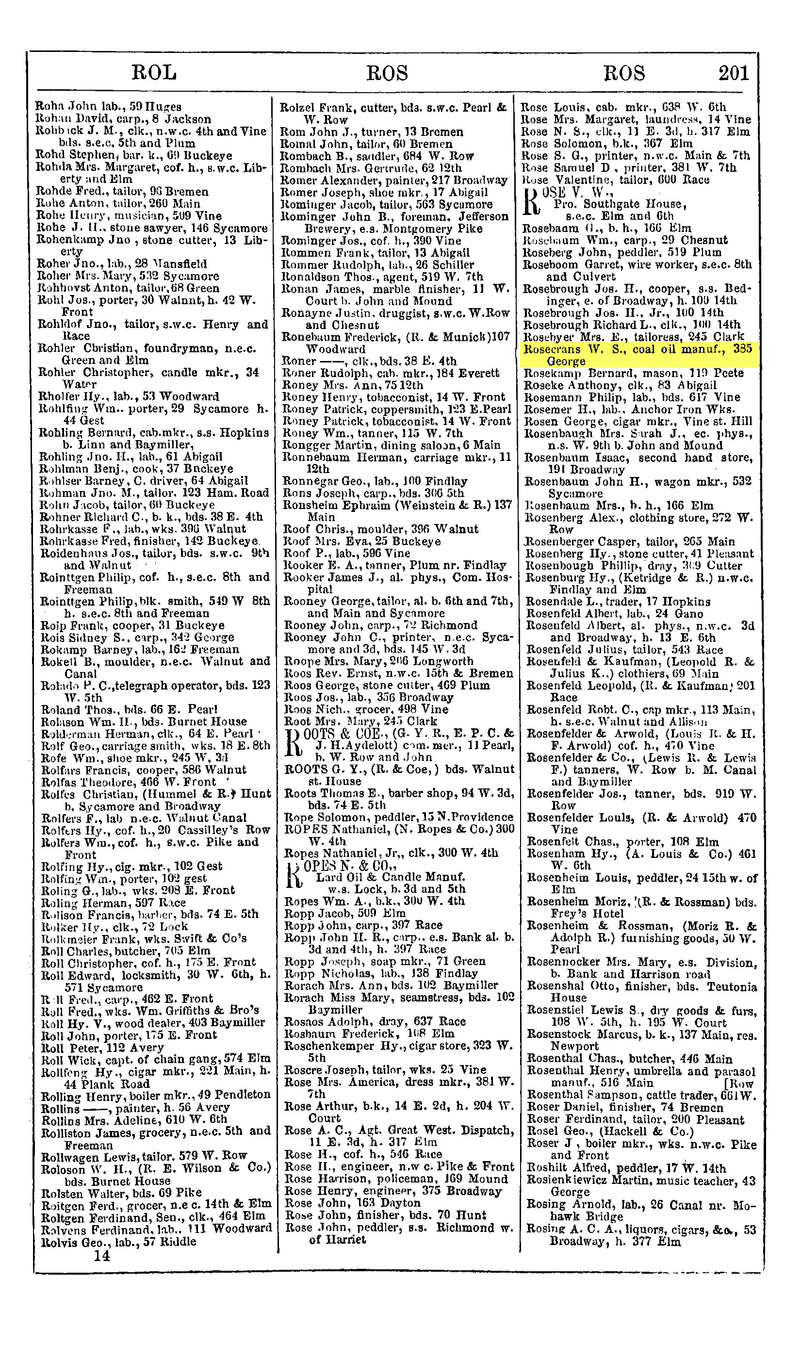 W. S. Rosecrans, a manufacturer of coal oil lives at 385 George Street |