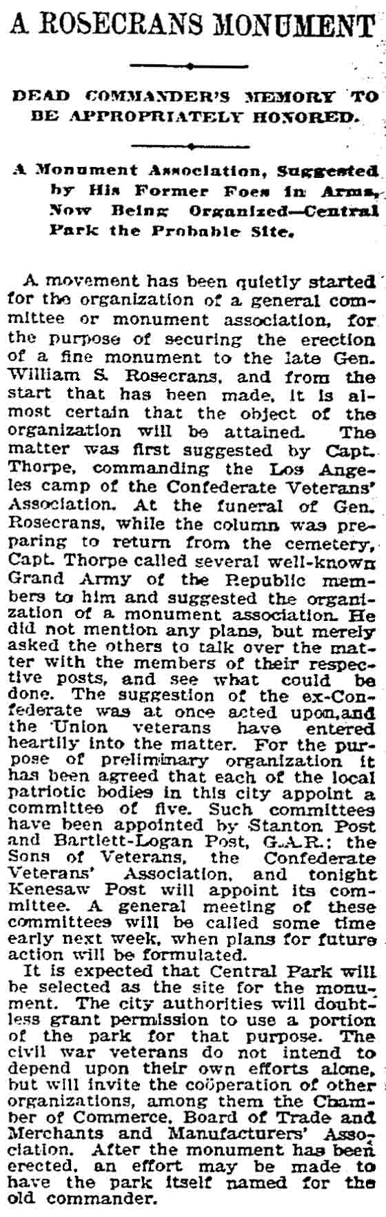 | A ROSECRANS MONUMENT: Dead Commander's Memory to be appropriately honored A Monument Association Suggested by his former Foes in Arms |