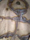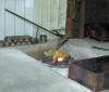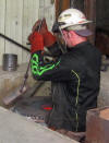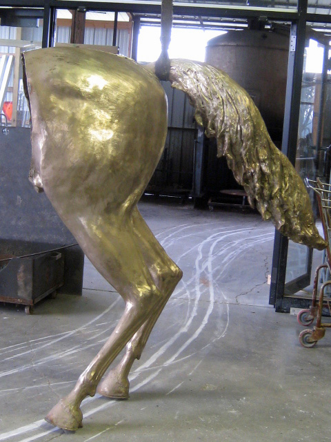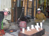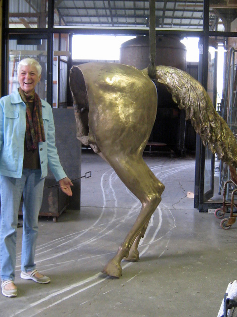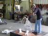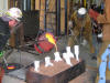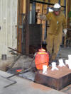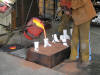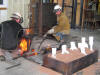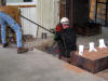 After four months of work, Alan Cottrill's clay statue is cast into bronze. The process is not a quick job but slowly worked on a little piece at a time. The larger than life equestrian statue is carefully reduced to hundreds of small pieces which will each be cast then welded together to form the statue which will stand on Sunbury Village Square. We saw 5 pieces cast using 300 pounds of bronze. | ||||||