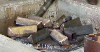 Crucible of Hot Bronze Removed from Furnace - Pouring Begins |