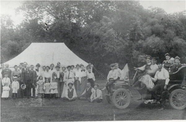 Some where around the turn of the century, a group of local people formed the Magazine Club. Early members were Dr. and Mrs. G. H. Gerhardt, Mr. and Mrs. James Cockrell, Mr. and Mrs. Kim Sedgwick. Mr. and Mrs. G. J. Burrer. Perhaps it was a literary club in the beginning but one of the club's projects was building a resort known as Camp Clifton. Summers were hot in towns and cities so it was popular to go to the country for cooler more relaxed living. New Yorkers went to the Adirondacks, Central Ohioans went to Camp Clifton. Plans began in 1909 to build the resort. The earliest mention of the camp is a note in The Sunbury News which stated The Magazine Club was opening Camp Clifton on July 4th 1910. Other names linked with the enterprise were P. W. Gage and Charles Wheaton. Located northeast of Sunbury at 12474 N. Old 3-C Highway along the Big Walnut Creek, the camp consisted of several cabins and a large dining room. Picnicking, boating, fishing and swimming were some of the featured entertainments. A railroad spur provided access from the outside. Cooks were hired to provide the food. Families would go to the camp for a weekend, a week, a month or even a summer. Sunbury had a Community Picnic there August 38, 1918. All stores in Sunbury closed for the day except the restaurants which closed from 12:30 to 5:00. The Committee urged residents to "Bring your baskets well filled and spend the day with your neighbors." Seated in front row of the picture above are Minerva Hess Burrer, Mr. Hess, Gertrude Burrer Mrs. L. R. Smith, a Leemy girl, Daisy Burrer holding Carleton Burrer, Jakie Burrer, Gordon Burrer, unknown child, Mrs. Cockrell and Mrs. R. W. Gage. In the back row are Parker Burrer holding Gerald Jacob Burrer, K. O. Burrer, P. W. Gage, Magus a camp employee, Dr. Gerhardt, Mrs. and Mr. Leemy, L. R. Smith, Charles Wheaton, Otis Wheaton, Mrs. Cockrell, Mrs. G. J. Burrer, Mrs. Wheaton, a cook, Dean Cummings, and another cook. Camp Clifton ceased to be an exclusive resort around 1920 but continued to be used for civic events such as Sunday School picnics, cookouts and a great spot for hikers. |