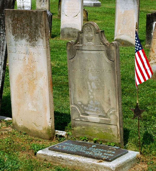 Benjamin Carpenter born Jan. 20, 1750 in Orange County, New York. During the American Revolution he served as a Lieutenant in 10th Regiment of Pennsylvania and was in Battle of Wyoming, July 3, 1778. What we know of his life has been documented by Ruth Truxall in From Then Till Now: Methodism in Sunbury, Ohio 1811-1964.