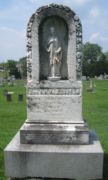 horse who knew the routes and got him to the services. Van Houten was born in New Jersey on October 13, 1814, to David and Margaret Van Houten. In the 1850 census he is shown as a blind peddler age 34, married to Allice Sarah VanHouten (age 28) living in Berkshire Township, Delaware County. In 1851 the statue at the right won first place in the Ohio State Fair sculpture contest. It was called the Blind Preacher. In 1860 census Van Houten is a blind clergyman in Lincoln County, Tennessee, with his wife Sarah and 2 daughters Mary age 12 and Allice age 5. In the 1870 census he is a blind minister in Delaware with his wife Sarah and daughter Alice J. On January 20 1876, he was riding his horse home on a foggy night and his horse lost his footing along the Big Walnut Creek and they went over the cliff. |