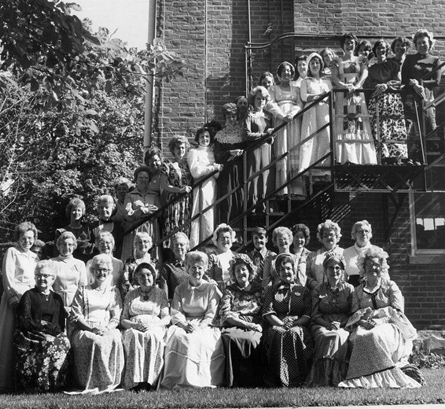 The quilt is now in the Burrer Memorial Room in the library. Here they are shown ready to hostess the first Tour of Homes. |