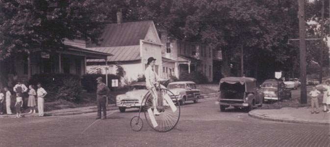 Community Library rented the front room in the former meat market at 68 E. Cherry Street. Eventually they had both rooms. Library Page Polly Whitney riding Sunbury News highwheeler in July 4th parade. Library behind her head. |