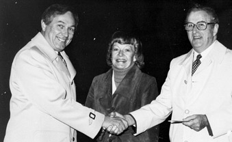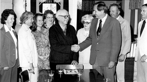 Harold McMillan giving the Hopkins House to the library in 1978. Genevieve Beaver, Francis Ruthig, Library Director Rachel Edwards, Lolly Searles, McMillan, Mary Lou Beacom, Dick Sechrist, Wayne Reppart and Wendell Davidson. |