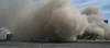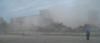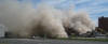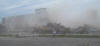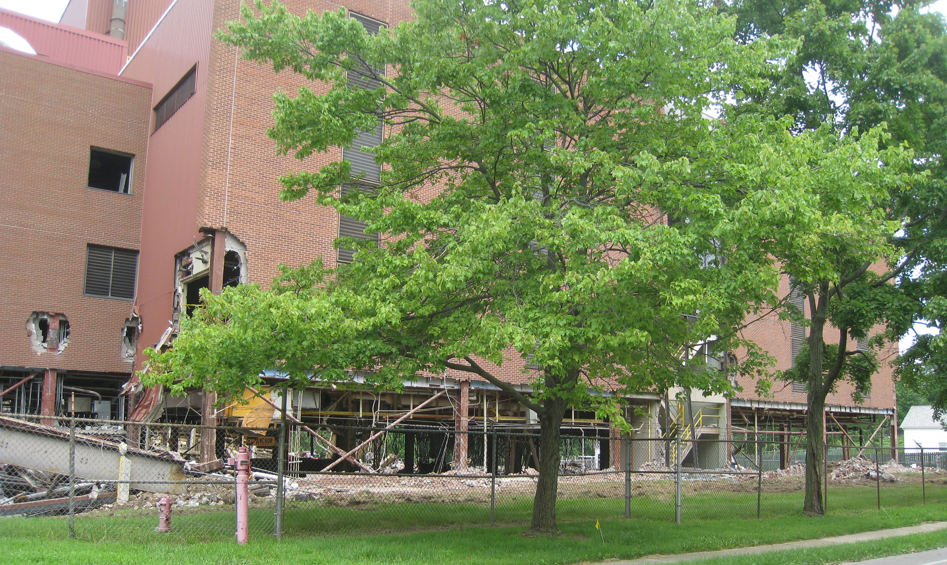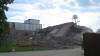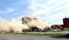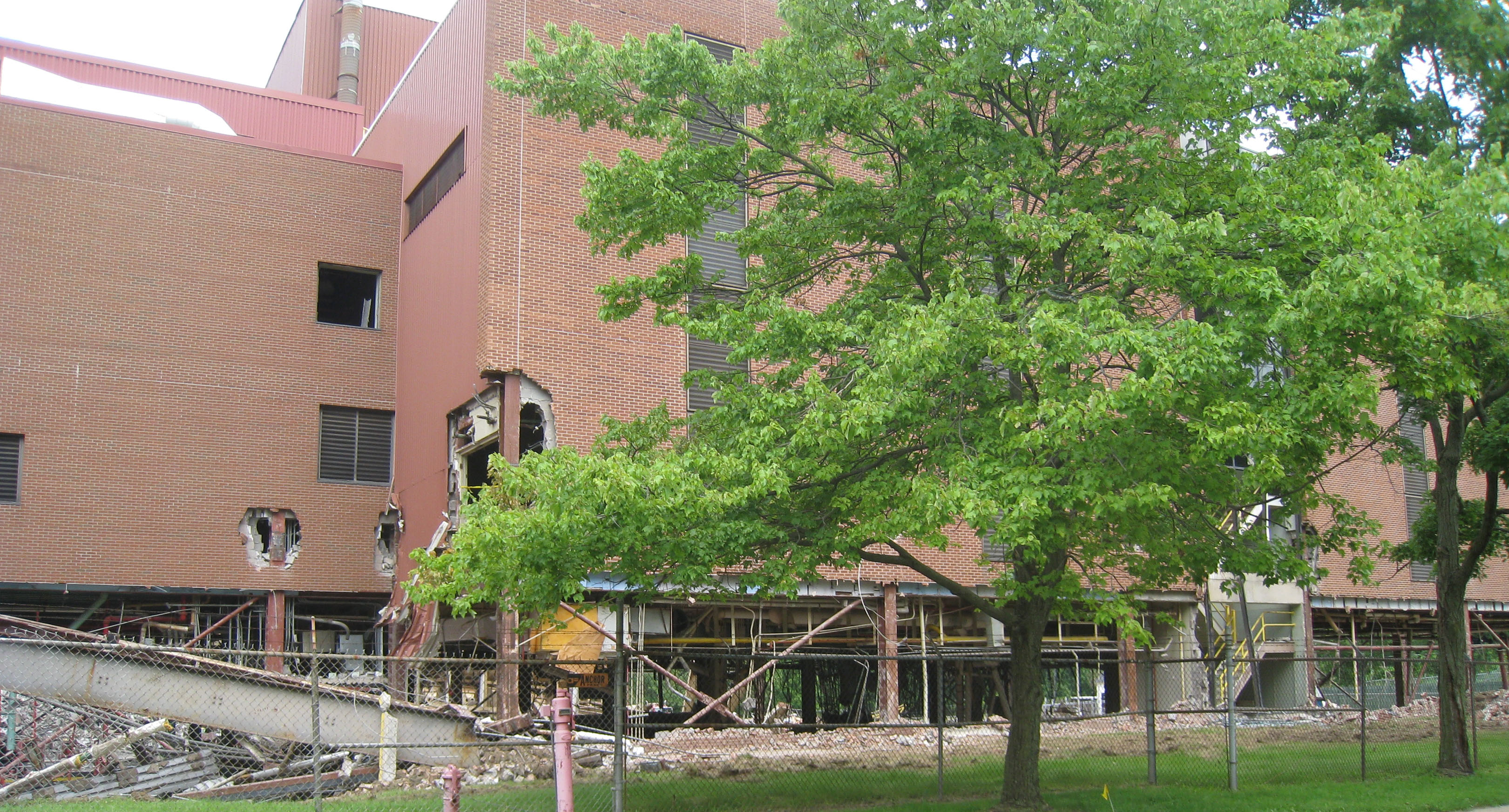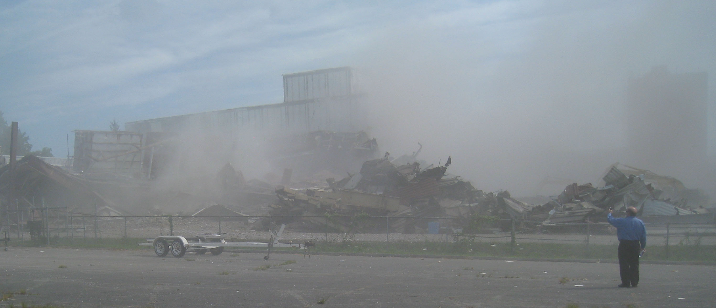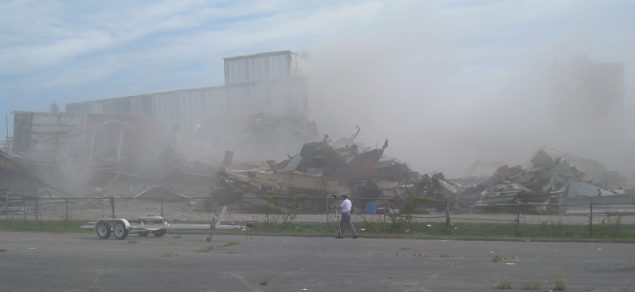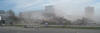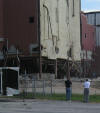 Cables were connected to the building and to large equipment which began to pull but the building did not move. Note men are working around piles of materials already removed from the facility. |