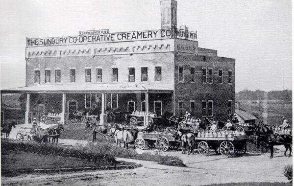In 1892 the Sunbury Co-Operative Creamery was organized by a group of farmers and businessmen. The company was incorporated for $6000 with shares selling at $100 per share. The original directors were Jasper Boyd, Joseph Kimball, Tom Andrews, O. H. Kimball, W. P. Roberts, John Landon and Kimball Sedgwick. Other early directors were James Cockrell, Seeley Boyd, George Cleveland and Mrs. J. R. Wilson. Joseph Kimball became the first plant supervisor. Sunbury Co-Operative Creamery had stations in Center Village, Kilbourne, Cheshire, Marengo and Condit. Cheshire took in 12,000 pounds of milk per day and Marengo took in 6,000. Each of the others received 20,000 pounds of milk daily. Cream was separated at the stations and the skimmed milk returned to the farmers to feed to their pigs. The cream was taken by horse and wagon to the Sunbury plant where it was made into butter and cheese. The Sunbury plant made 500 pounds of butter each day which sold for 25 cents a pound. Sunbury Famous Butter was shipped all over the country in 50 pound cartons. Every three months a carload was shipped to New York City. Farmers were paid 5 cents a pound for their butterfat once a month. Garfield Chadwick, accountant for the Co-Op, and Clarence Geddis would meet with The Farmers Bank manager, Charles Armstrong, who was also treasurer of the Co-Op, after the bank closed and they would figure how much each farmer had earned and put his money in an envelope in gold. The next day Geddis and Chadwick would drive around to all the stations and deliver the money - a trip that took at least 4 days. In 1966, Geddis told The Sunbury News editor, Bill Whitney, "We never had any trouble or holdups." The Creamery purchased 4 wagons for delivering their products. While the wagons were beautiful, they were too heavy for the mud roads and were always getting stuck, so the Creamery sold them. In 1903 Kimball Sedgwick became plant superintendent. When Mr. Sedgwick became ill, Clarence Geddis operated the plant and supervised its sale in 1918. The creamery was sold to John Wildi Evaporated Milk Company for $25,000. The sale included the buildings and equipment in Sunbury, Condit, Kilbourne and Cheshire. Evaporated milk and cheese were the big products. A year later the company consolidated with Nestle Alimentania, S. A.