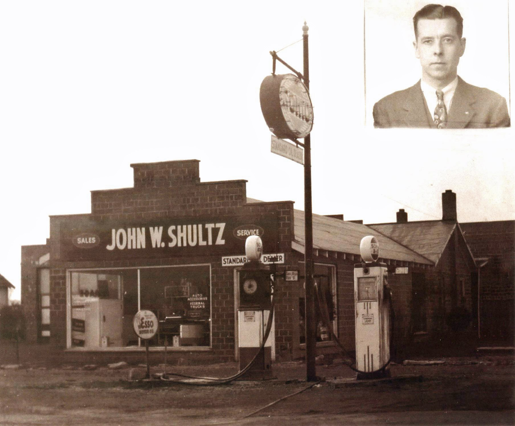 John W. Shults and his Sales and Service Company in 1937. Appliances sold along with gasoline. |