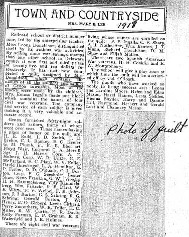 A beautiful "service quilt" containing the names of the 58 men from Genoa township, this county, who participated in the great war, will be auctioned off at the Railroad school in that township on the evening of May 21. Proceeds will go to the Red Cross. Colonel J.O. O'Roark, Delaware, will be the auctioneer. The quilt is the work of pupils of the school |