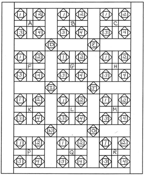 Locating Names on Quilt The Key to Locating the Names on the Quilt is in the far right column in line with the Soldiers' or Sailors' Names Floyd Blair is in Bottom Right Corner of Block B at the Top of the Quilt in the Middle Patch. |