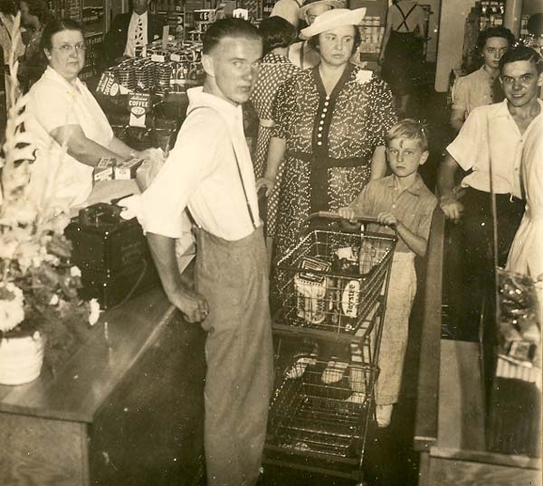 Former Columbus residents, Mr. and Mrs. James White opened their Sunbury Super Market in the first floor of the K of P building they recently purchased. The Grand Opening on August 7, 1940, featured many special sales and twenty free baskets of groceries. This self-serve food market is the first "Help Yourself" store in eastern Delaware County and the first in any village this size in central Ohio. Mrs. Food Shopper enters the store where she finds her market basket on wheels which she pushes, like a baby buggy, around the store filling it with groceries, meats, fruits and vegetables. "We will do our best to give this community the finest of national advertised food at super market prices," Mr. White told The Sunbury News editor. With eighteen years of experience with a large chain organization in Columbus, Herbert Gall is in charge of the grocery department. Harry 'Spot' Payne is the manager of the meat market featuring Armour's, Swift's, and Falter's meats. Mr. and Mrs.. White and their daughter Ina Lee White are operating the market.