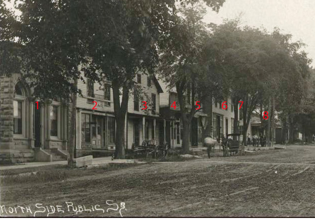 Construction 2. Benoy building housed The Sunbury News, Deering Hardware 3. Benoy house before turned. The Sunbury News after turned 4. Restaurant became Whitney Insurance, 5. Barber Shop then Sunbury Grill, 6. Perfect - Patrick Store, which later was Virgil Edwards Motorcycle Shop, Lester Warner's Photography Studio, ice cream store. 6 & 7. are Patrick Building, Racket Store, which became Chauncey Root's Building after 1927 fire. Later Virgil Edwards, Miles, Iacono's Italian Restaurant and Linda Powell's Linda's 3. 8. is the Truman Thomas house across Vernon Street |
