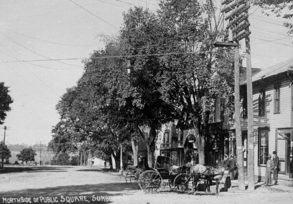 Benoy House before turned (The Sunbury News), Whitney Insurance, Sunbury Grill, I. M. Price Crown Pianos and Furniture. Patrick Building wraps around the corner. It housed the Perfect - Patrick Store, the Post Office, a Shoe Repair Stop | ||||