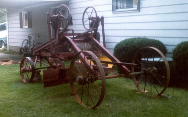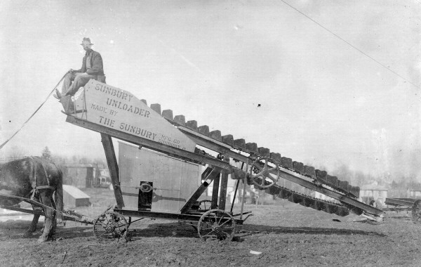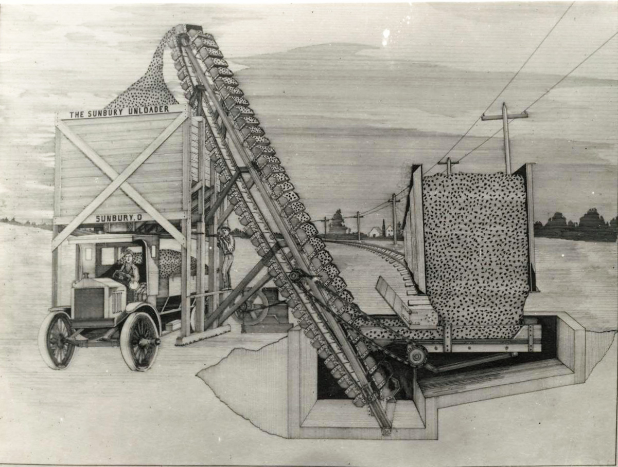 Drawing showing the Sunbury Unloader moving a product from a train car to a loading tank and into a farm wagon. The company had a patent for the Sunbury Unloader. |