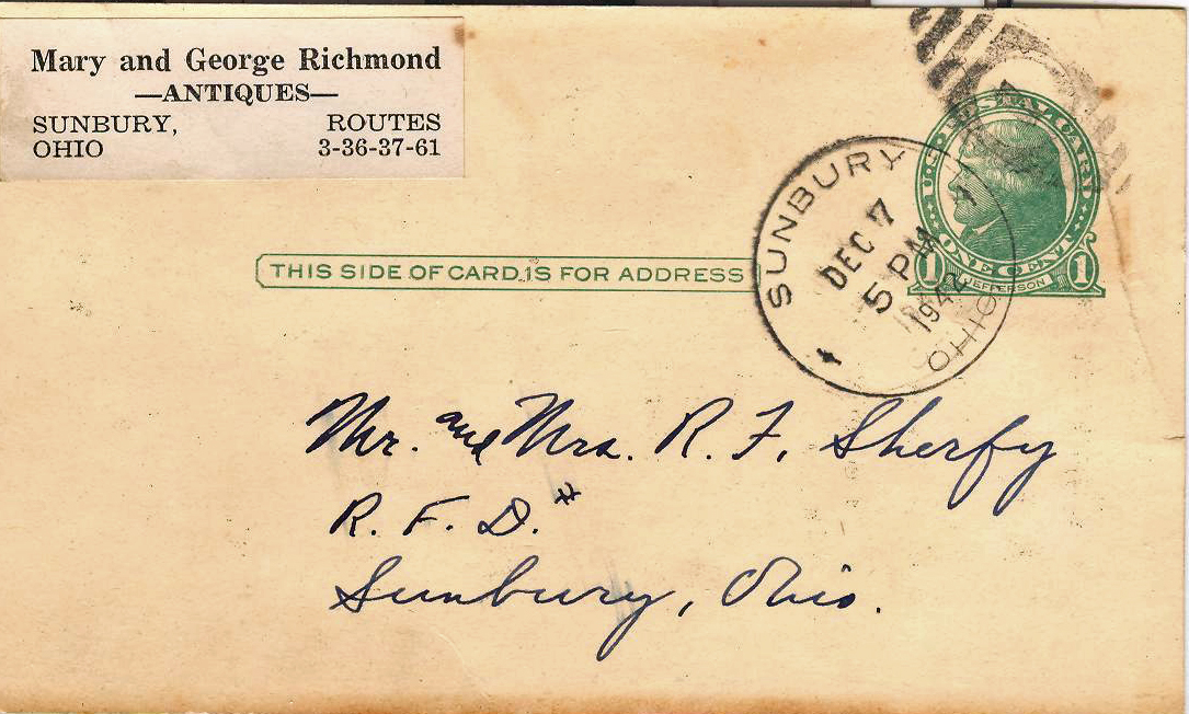 Postcard was mailed December 7, 1942. The Richmonds also had Log Tourist Cabins overlooking the Big Walnut Creek behind their house. |