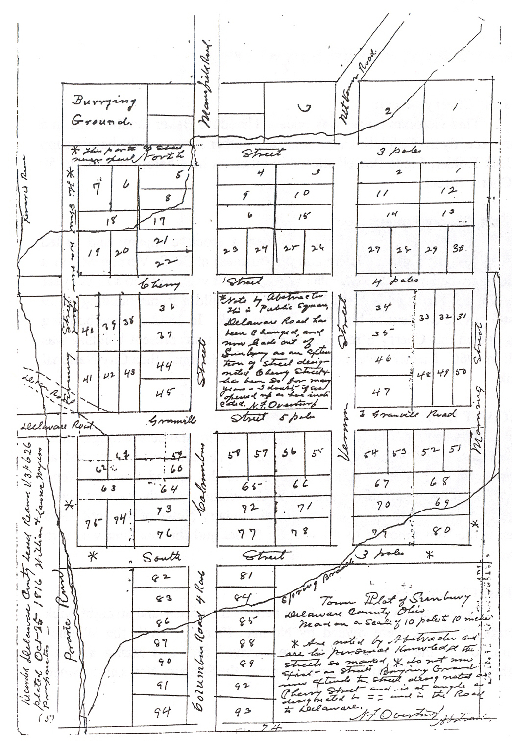 Norman F. Overturf signed this abstract rendition of the original plat for Sunbury laid out by the Myers brothers in 1816. Overturf was Probate Judge in Delaware County Feb 1888 to Feb 1894. Note he put * on streets which were never opened. |