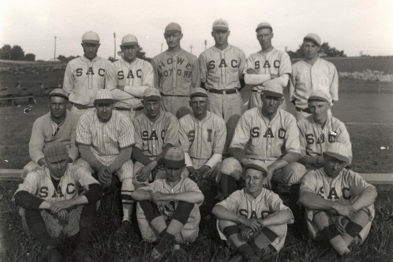 DICK DE VORE, first baseman; COB FERRIS, catcher; BYRON HOKE, pitcher; BOB HOKE, left fielder; DOC BRICKER, shortstop; HOWARD BRICKER, second baseman; DICK HOKE, third baseman; BILL SHERMAN, center fielder; HUGH STRIDER, pitcher; ART BYRD, right fielder; BOB SMITH, Elsie Day's husband; LAURIS BENNETT, manager. WE PLAYED THE MODEL DAIRY FROM COLUMBUS AND BEAT THEM. THEY HAD A BUNCH OF THE COLUMBUS RED BIRDS ON THEIR TEAM. | ||||