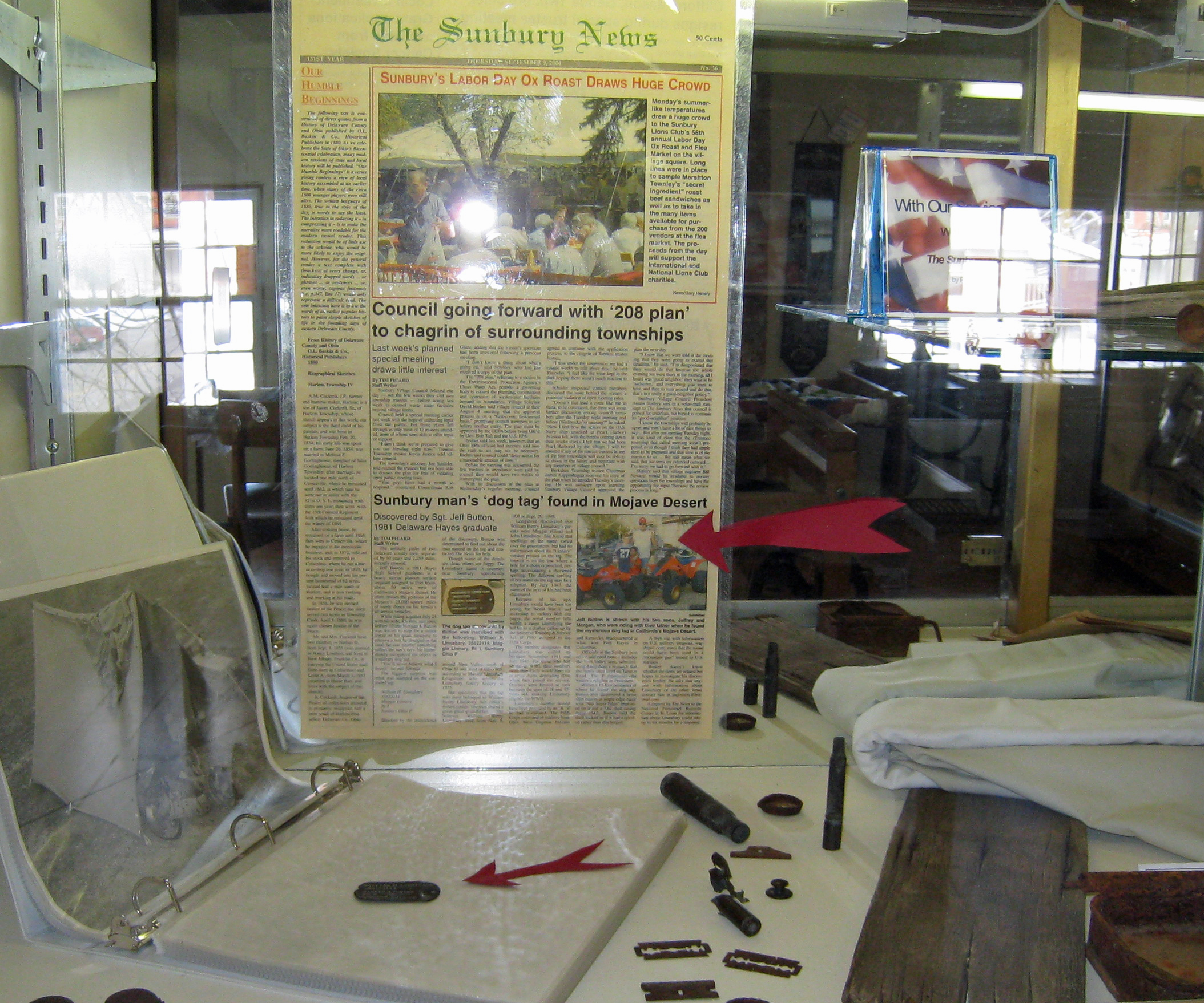 Clues from the tag told Buttton Maggie was his next of kin. Indeed it is his mother’s name on the tag and it was shortened because of the hole to hang the dogtag or perhaps it was just misspelled. In July 1943 they ceased putting next of kin on the tags so it was issued before that. Jeff discovered the serial number identified the soldier as a draftee called up by the Selective Training and Service Act of 1940 assigned to the Fifth Corps. The Fifth Corps consisted of men from Ohio West Virginia, Indiana and Kentucky headquartered at Fort Hayes in Columbus. Rt 1 was the postal area south east of Sunbury where the John Linnabary family lived. P stood for Protestant. Within a 15' perimeter of the dog tag, Button found a brass button, a single edged razor with "Star Super Edge" imprinted on it and a 7.62 shell casing dated 1942. The casing looks as though it was exploded rather than discharged. These items and other he found in the desert are in the display. Marian Whitney’s WWII Scrapbook told a little more about this soldier. William Linnabary was home on leave early in July 1943. He stopped in the News to chat with Editor Bill Whitney and said he had been stationed at Camp Haan located in Riverside County, in California. This is very near the Mojave Desert so it is easy to imagine he did maneuvers there. While on maneuvers Linnabary said he had to carry a 200 pound man on his back while running 75 yards and jumping hurdles. Each soldier was given a quart of water per day which had to take care of washing, shaving and drinking. They were requested to shave each day. Linnabary went on to say when he returned to camp, he would be in charge of the ammunition supplies for the entire outfit. Whitney noticed the Sharpshooter’s medal Longshore was wearing. He explained he had a marksmanship record for hitting 194 out of a possible 200. For 19 months Linnabary was part of the Black Panther Division in Europe. 36 days after leaving there he was discharged out of Fort Indiantown Gap in Lebonan County Pennsylvania on November 1945. A tribute to the 66th Infantry Division known as the Black Panthers is reproduced on the Internet There is a William is buried in Kingwood Memorial Park, Lewis