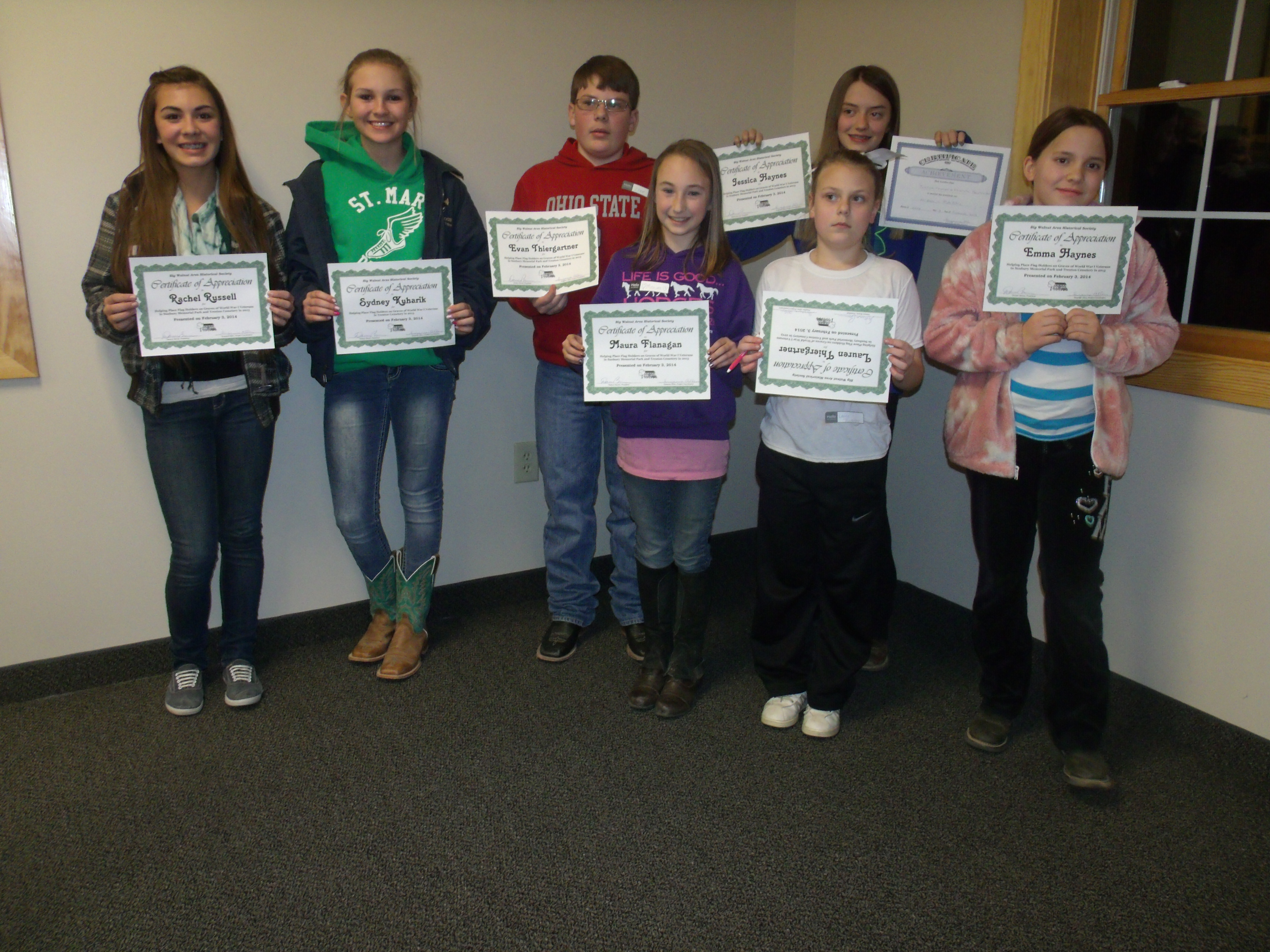 Big Walnut Area Historical Society Certificates were awarded to the boys and Girls from Sunbury Halter and Saddle 4-H Club who helped mark veterans graves for Memorial Day and Veteran's Day in 2013. |