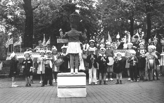 In the picture above, Carleton Burrer is accompanying Mrs. Maybelle Gammill's rhythm band which performed on the square for Memorial Day in 1940.  Charity Baker Walker directed the band composed of Ann Morris, Leroy Perfect, Sue Lenhart, Norman Townley, Clyde Perfect, Russell Fravel, Freddie Stith, Jim and Dave Whitney, Ross Day and Patsy Crowl.  Other members of the band are Carolyn Sue Turnball, Ann Meeker, Iris Spencer, Dorothy Meeker, Floyd Smiley, Nancy Williamson, Rachel Murphy, Suzanne Link, Douglas Perfect, and Eloise Fisher.