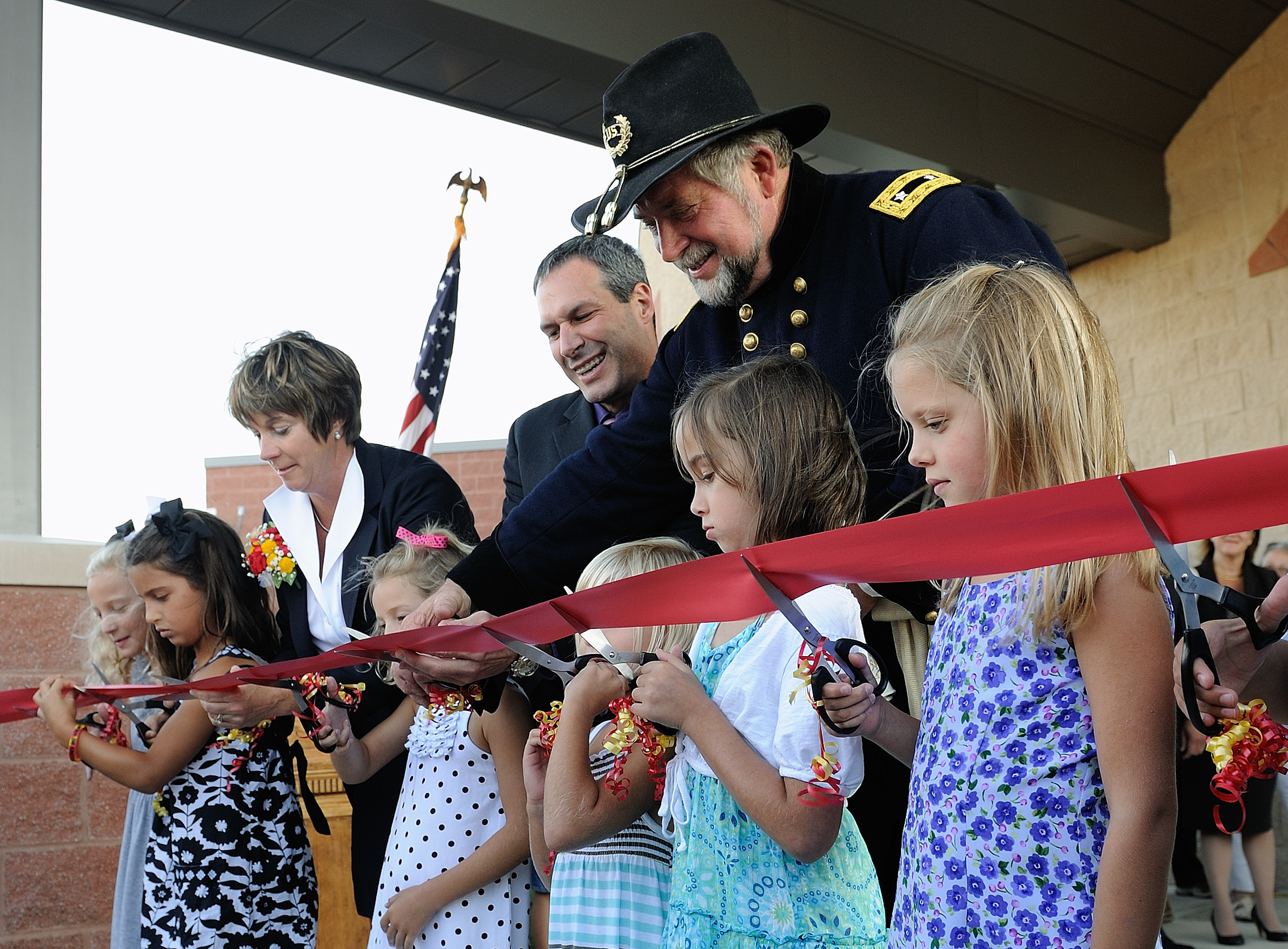 Principal Peggy McMurray, Superintendent Steve Mazzi, General Rosecrans help students cut the ribbon |