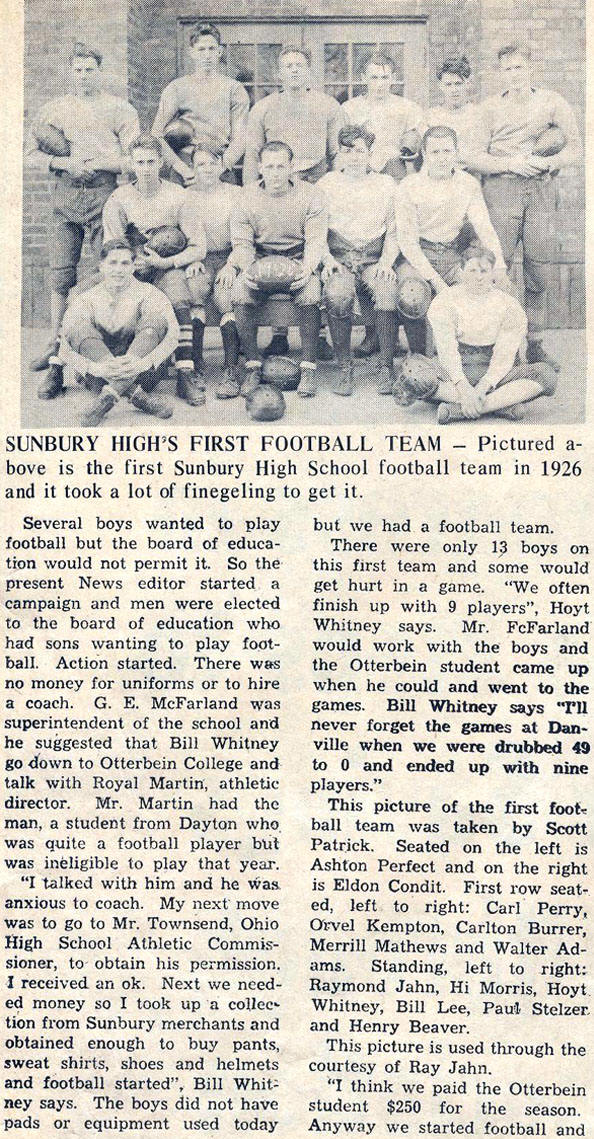 took a lot ot finegeling to get it. Galena had a team and had been playing since 1923 when their football team had a 35-0 record under Coach Lybarger. For some reason Sunbury’s board rejected the idea. Bill Whitney was the older brother of Hoyt who was one of the boys who really wanted to play. Bill recalled the events which led to Sunbury’s first football team in a Sunbury News article published June 30, 1966. |