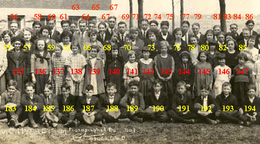 #59 Mildred Lahmon, #62 Anna Mae Meeker, #69 Carl Loar, #72 John Comstock, #73 Helen Morris, #76 Teacher Miss Jeffrey, #81 Owen Meredith, #86 Earl Cline, #140 Mary Ellen Fisher, #141 Virginia Boston, #142 Willella Myers, #146 Julia Loar, #147 Mable Snavely | ||||