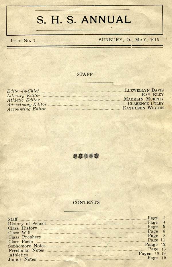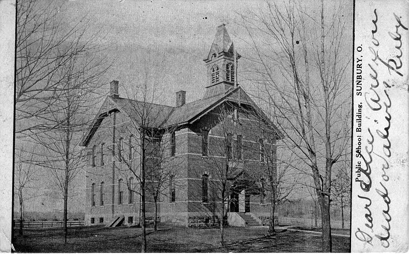 Boys and girls in Sunbury attended a log school on the southwest corner of Sunbury square. The facility was also shared with a church. When the structure was no longer needed it was divided into 2 parts which became the nucleus of individual homes - one was torn down for the parking lot at southwest corner of Vernon and Harrison. The second is part of the Stith house at 77 Harrison Street. Col. Frambis raised money to build a private school on the village square. Bricks for the school were baked on the farm just west of Sunbury where CVS and Community Library are in 2003. The two story building (costing $5000) was completed in 1868 with a third floor added by the Masonic Lodge. Classes began but money to pay teachers and expenses was not available and the school closed in three years. The students returned to public schools. In 1878, a 2 story public school was built on Harrison Street for $5,000. Sunbury School is located at the southwest corner of 3 acres facing Harrison Street. The high school students used the first floor of the Town Hall while the Harrison Street building housed the elementary school children. Mr. G. K. Sharp was the first superintendent of Sunbury High School. To receive a high school diploma, you were required to earn at least sixteen credits in not less than four years. The required subjects for the first year of high school were algebra, English, and general science. Latin, botany and geography were elective subjects. Graduations were held in the Baptist Church, K of P Hall, and the Town Hall. In 1911 when the village wished to extend Vernon Street, it was decided not to extend it through the school grounds to Rainbow Avenue as children could be hurt by the traffic. The village was growing and through centralization more students were coming into the school from part of Berkshire, Kingston, Porter and Trenton townships so soon the building became too small. In 1913 two additions were added. A 13' x 24' room was added to the front of the first building and a 13' x 13' building was added to the back. These gave an aerial view like a cross. At this time the lower grades were on the first floor and the Sunbury Junior and Senior High Schools were on the upper floor. W. B. Winters was awarded the bid for repairing the school and constructing the addition for a bid of $10, 995. Columbus Heating and Ventilating Company received the contract for the automatic heating system for $2440. According to the 1922 yearbook, the school sat among 52 shade trees,