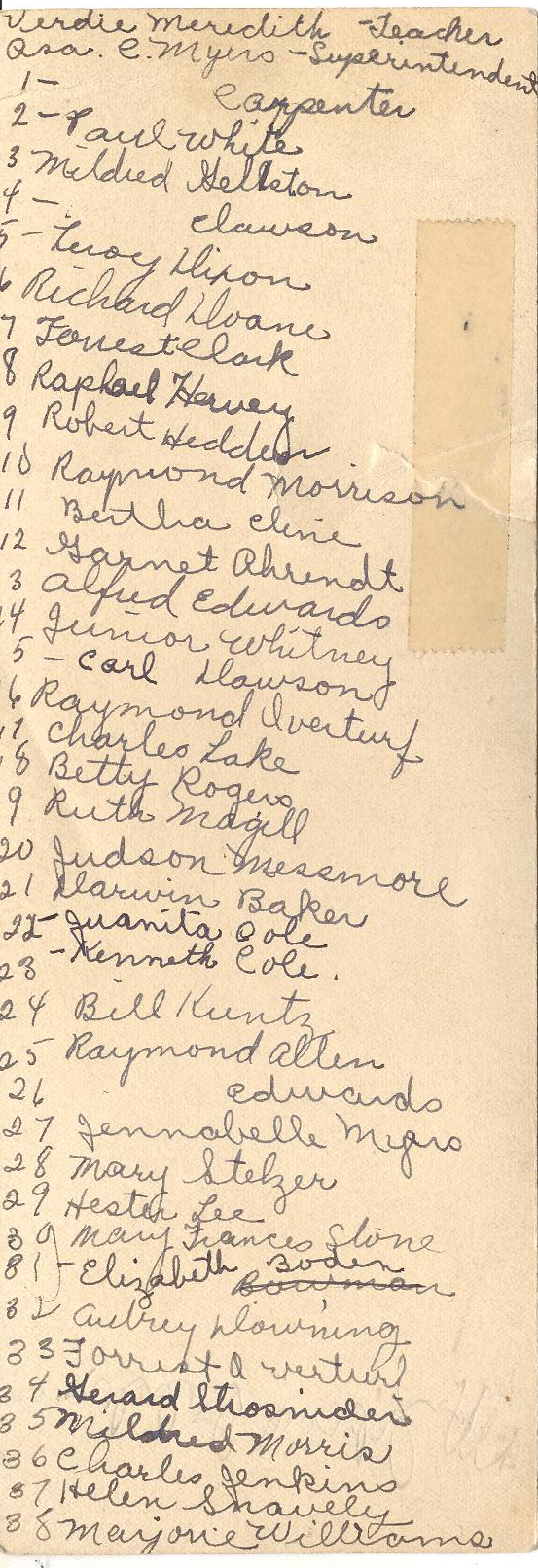 Whitney, 15. Carl Dawson, 16. Raymond Overturf, 20, Judson Messmore, 21. Darwin Baker, 22 juanita Cole, 23. Kenneth Cole, 24, Bill Kuntz, 25. Raymond Allen, 26. ? Edwards, 27. Jennabelle Myers, 28. Mary Stelzer, 29. Hester Lee, Elizabeth Boden. 30. Mary Frances Stone, 31.Elizabeth