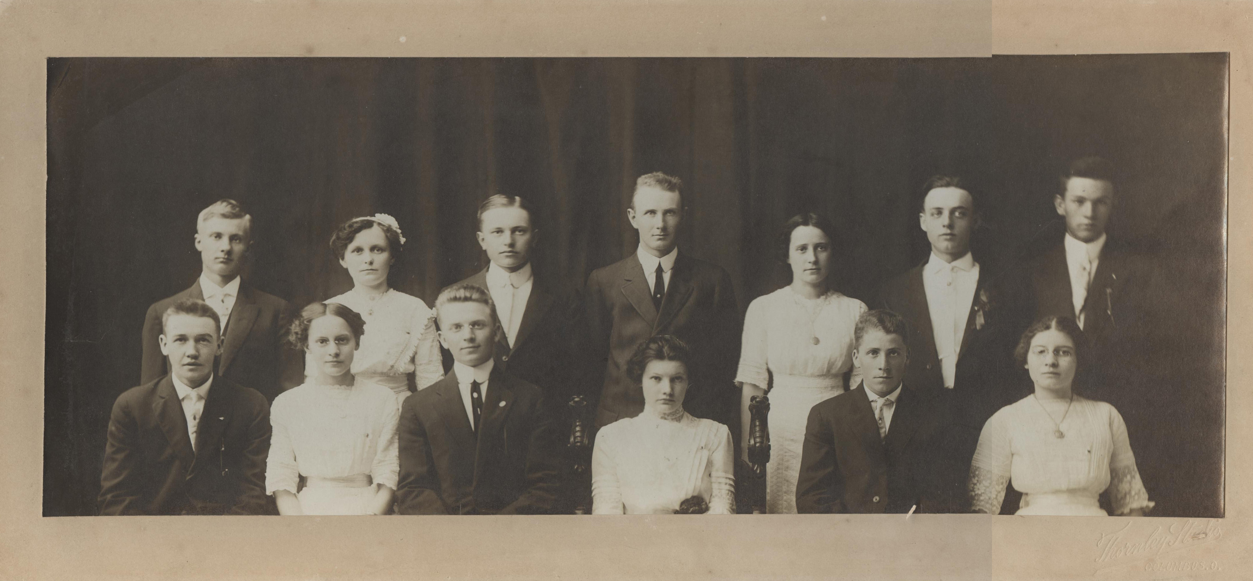 McCaughey Front Row: Harold Dustin, Esther (Bennett) Glass, Perry Newman, Catherine Grove, Ed Platt, Madge (Budd) Barrows |