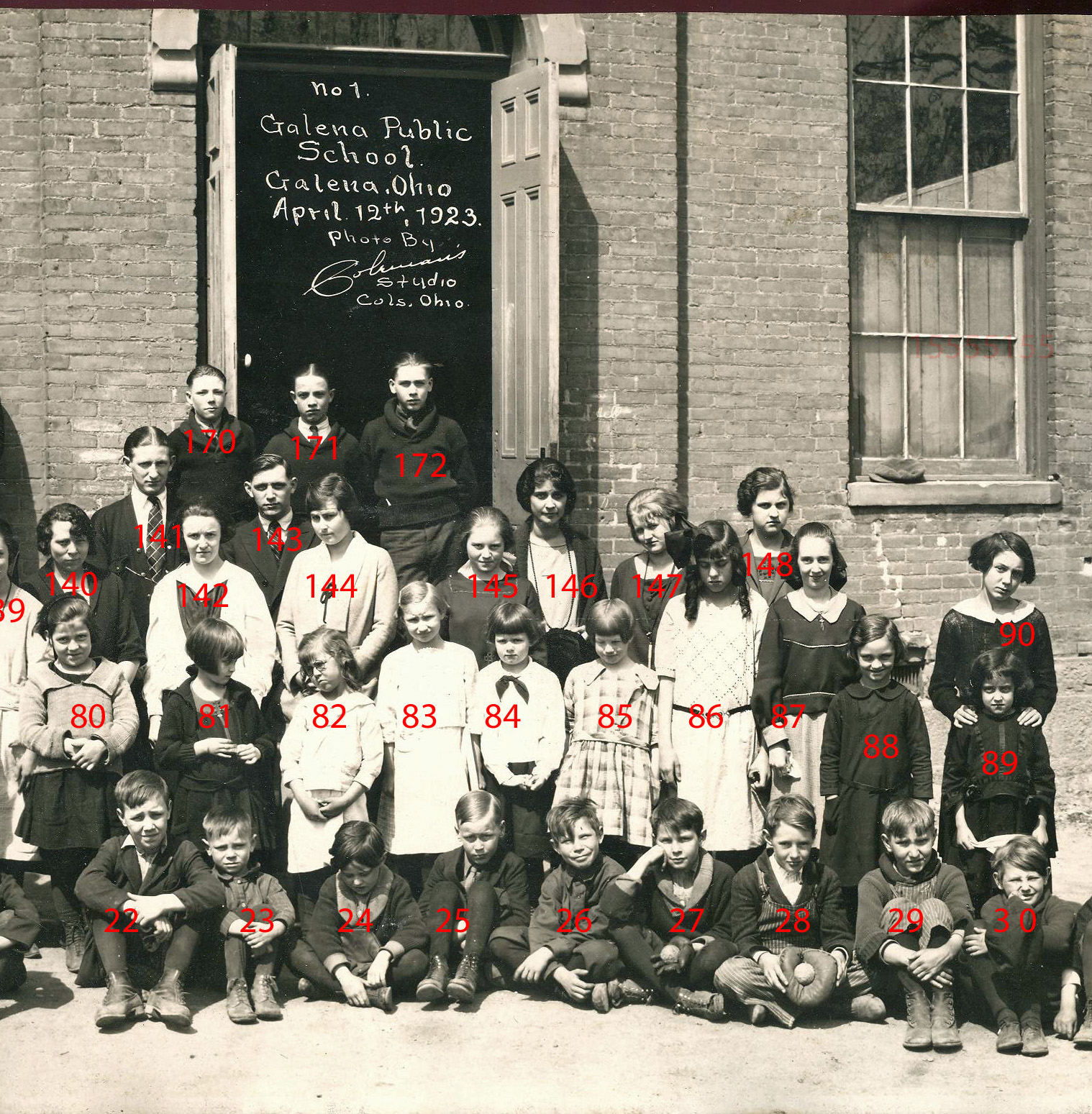 Front Row: 22. ?, 23. ?, 24. Mervin Garlinghouse, 25 Bob Furnance, 26. ?, 27. x Bonnett, 28. Von Mantor, 29. Casie DeBolt, 30. ? Second Row: 80. Dorothy Fissel, 81, ?, 82. x Smith, 83. Nellie DeBolt 'Longshore', 84. Leta Day, 85. Jennifer Smith, 86. ?, 87. Almire Dustin, 88. Mary Gore 'Johnson', 89. Mildred Garlinghouse, 90 ? Third Row: 140. x Hughes-teacher, 141. Oliver Johnson- teacher, 142. Marie Johnson- teacher, 143. ? teacher?, 144. Mary Freeman, 145. Virginia Cooley, 146. ?, 147. Zelfa Fisher 148. Fourth Row: |
