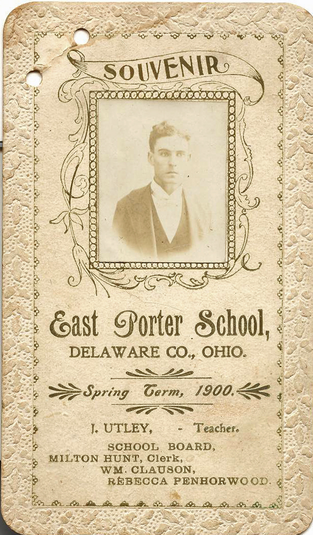 Milton Hunt served as Clerk of the School Board. He was born in New York in 1839 . in 1870 census he and wife Emma (Moody) lived in Monroe, Knox County with sons William (born 1864) and Alfred (born 1868). Milton was a farmer. In the 1880 census they lived in Porter Township and had two more children, Alberta (1872) and Lee (born July 25, 1879). Milton continued to farm. By 1900 Alfred had taken over the farm and Milton and Emma lived with him. Lee and his wife Mable farmed next door. Milton lived in Centerburg when he died in August 25th, 1926. Wm. Clauson was a farmer and the father of Jessie Samuel Clausen. He was born in June 1851son of Samuel (born 1826 in New Jersey) and Ruth (Davey born 1835 in Maryland). In the 1870 census Samuel's family lived in Porter Township with an Ashley post office and four children. In 1882, William married Alice Owen born May 1864 and they had Lamoil born May 1882, Jesse Samuel born June 1889. In 1900 they lived in Porter Township next door to William's brother Winfield and wife Cora and nephew Royal Gilmore Clawson. William died June 7, 1924 in Delaware County. The last name of the family is usually spelled Clawson. Rebecca Penhorwood was the widowed