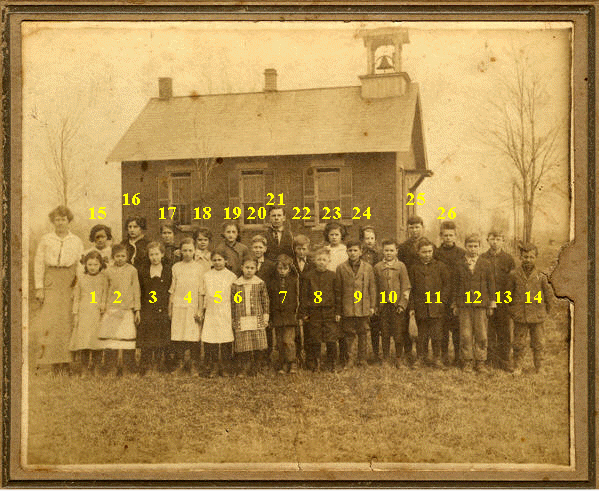 Front Row: | Teacher Sadie Wilson. 1 Buelah Ross, 2 Ameda Day, 3 Dorothy Murphy, 4 Viola Walker, 5 Mable Day, 6 Lela Barcus, 7 Burt Horn, 8 Caroll Blamer, 9 David Ross, 10 Floyd Day, 11 Art Higgins, 12 Dewitt Chalfin, 14 Leo Barcus | |||