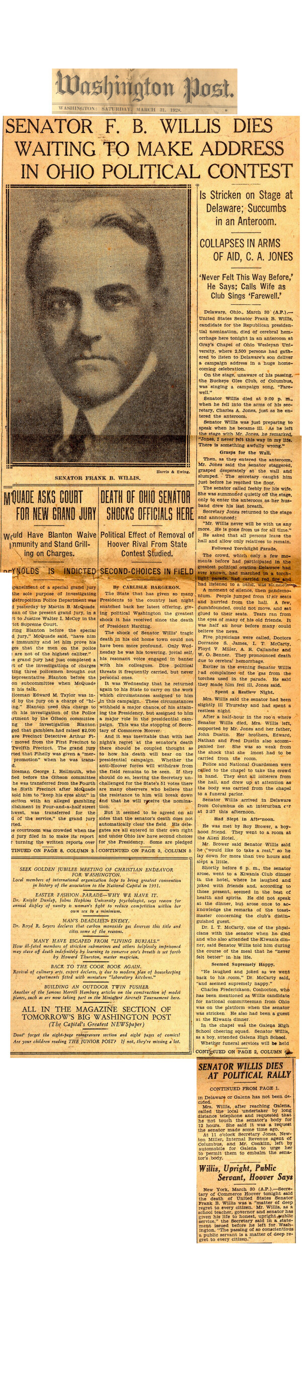 My grandfather, Senator Oatfield Whitney and his wife were in the audience that night. The event was reported in the Washington Post.  While 2500 people listened to the Buckeye Glee Club sing the campaign song, "Farewell,"  Willis called his wife, grasp his aid, Charles Jones, and the wall saying, "Jones, I never felt this way before.  Something is awfully wrong."  He suffered a fatal heart attack while waiting the opportunity to address the full house and died at 9:09 p.m.