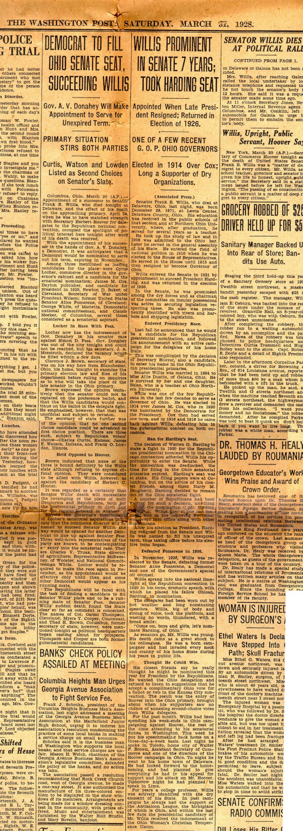 DELAWARE GAZETTE, March 30, 1928: "The Willis-for-president Homecoming crowd commenced to gather in Delaware early Friday afternoon. Visitors from all parts of Ohio and citizens from all areas of the country were arriving in large numbers to assume an active part in making the big Willis celebration the greatest event of its kind ever held in Delaware.