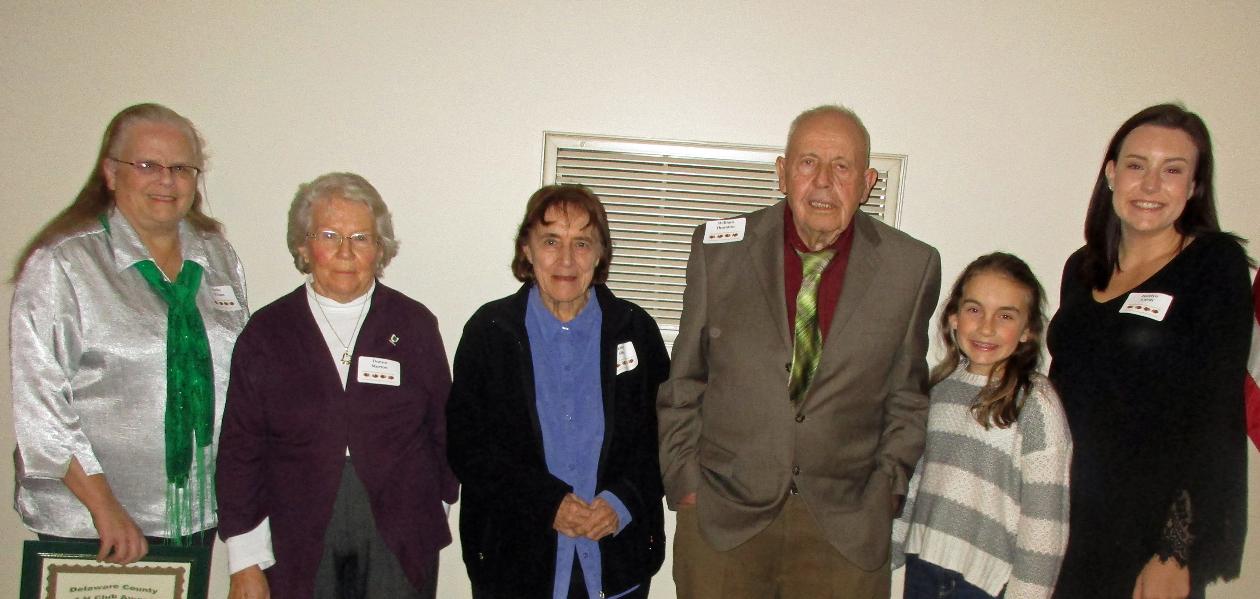 Bill Comisford, president of the Big Walnut Area Historical Society, presented certificates to those members who participated in the Memorial Day and Veterans’ Day soldier tributes to those soldiers of the Korea Police Action and Vietnam War buried in Burnside and Sunbury Cemeteries. The club presented a donation to the American Legion Post 457 to buy veteran flag holders. | ||||