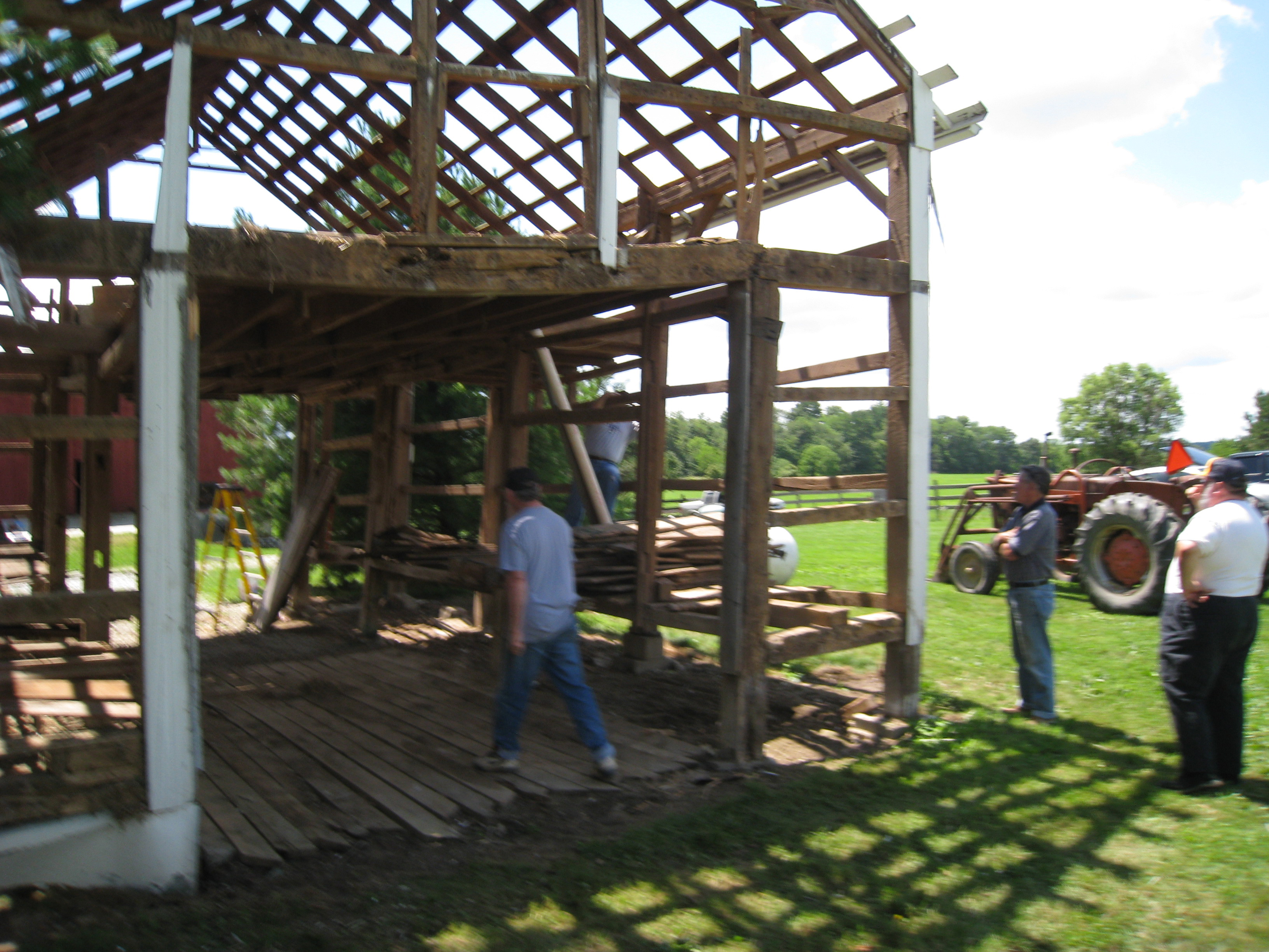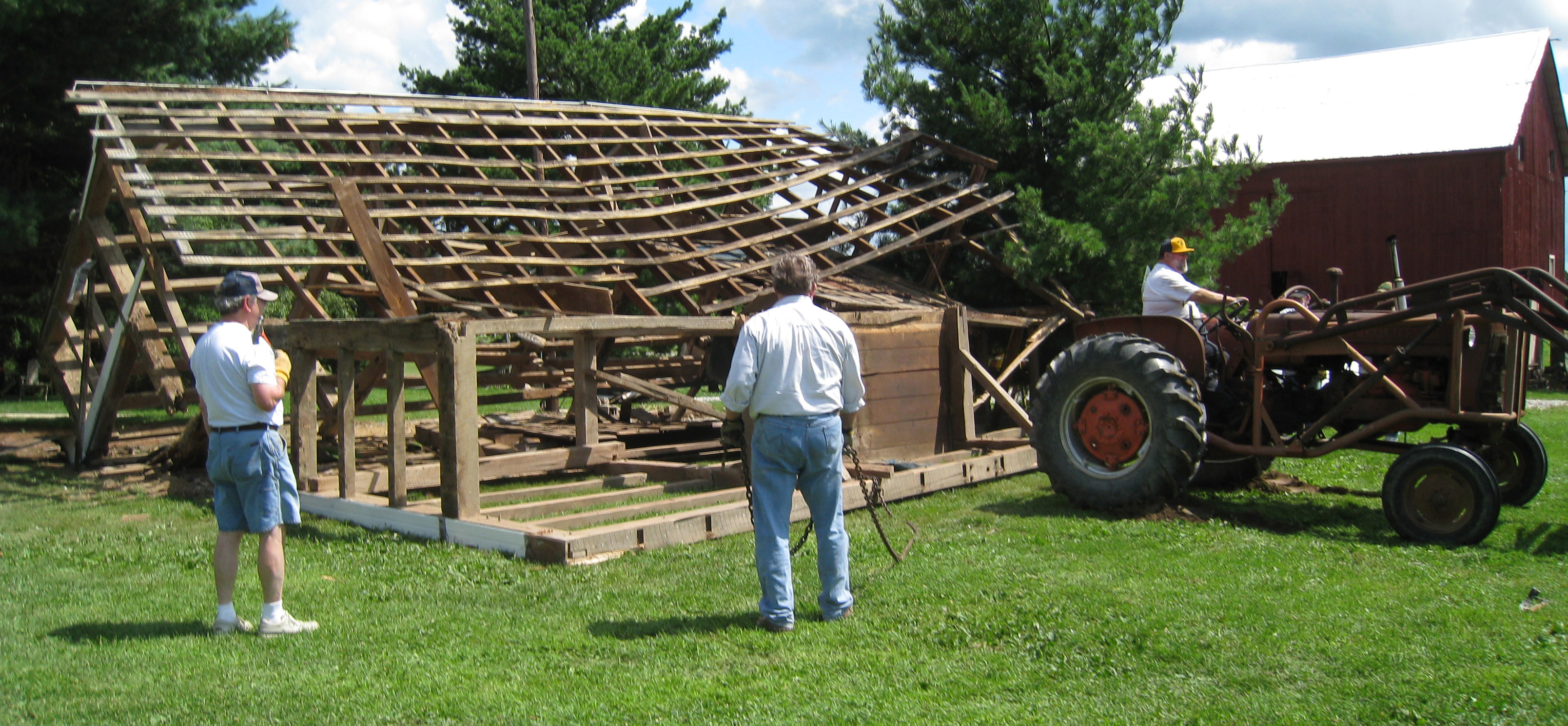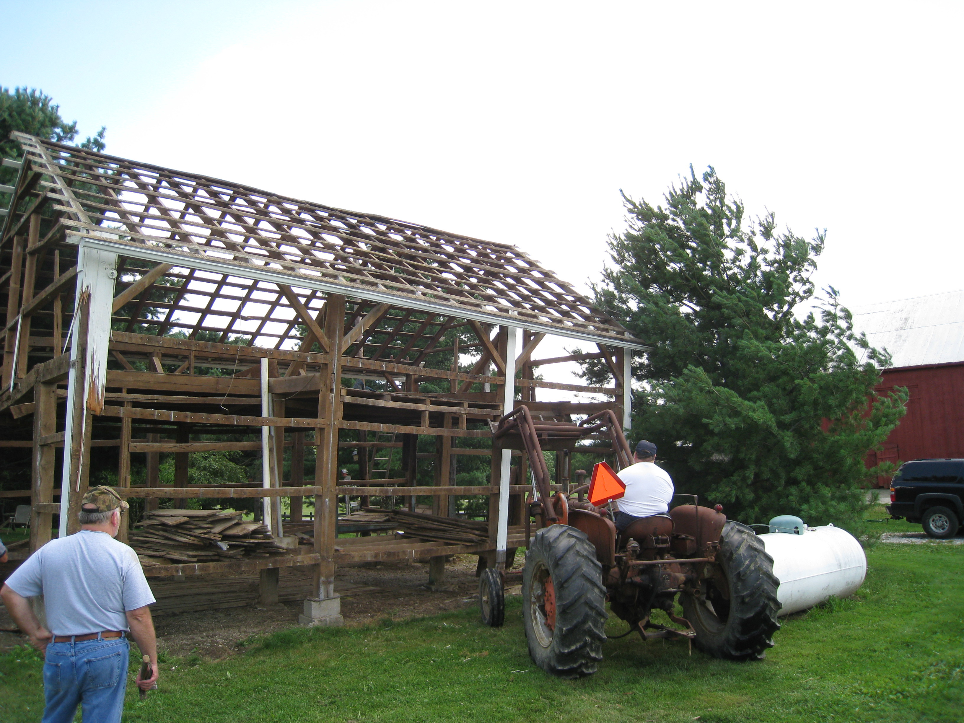 All through the night the barn creaked and cracked. It was definitely leaning more than the day before. It soon became unsafe so the men decided to help it down. Rick used a 1961 Allis Chalmers for the task |
