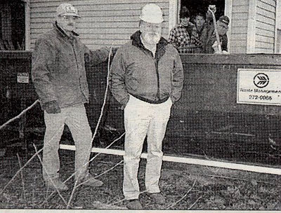 Dick Yoerger, Sandy Andromedia in front of the dumpster, Bob Horn between two community service youths in doorway