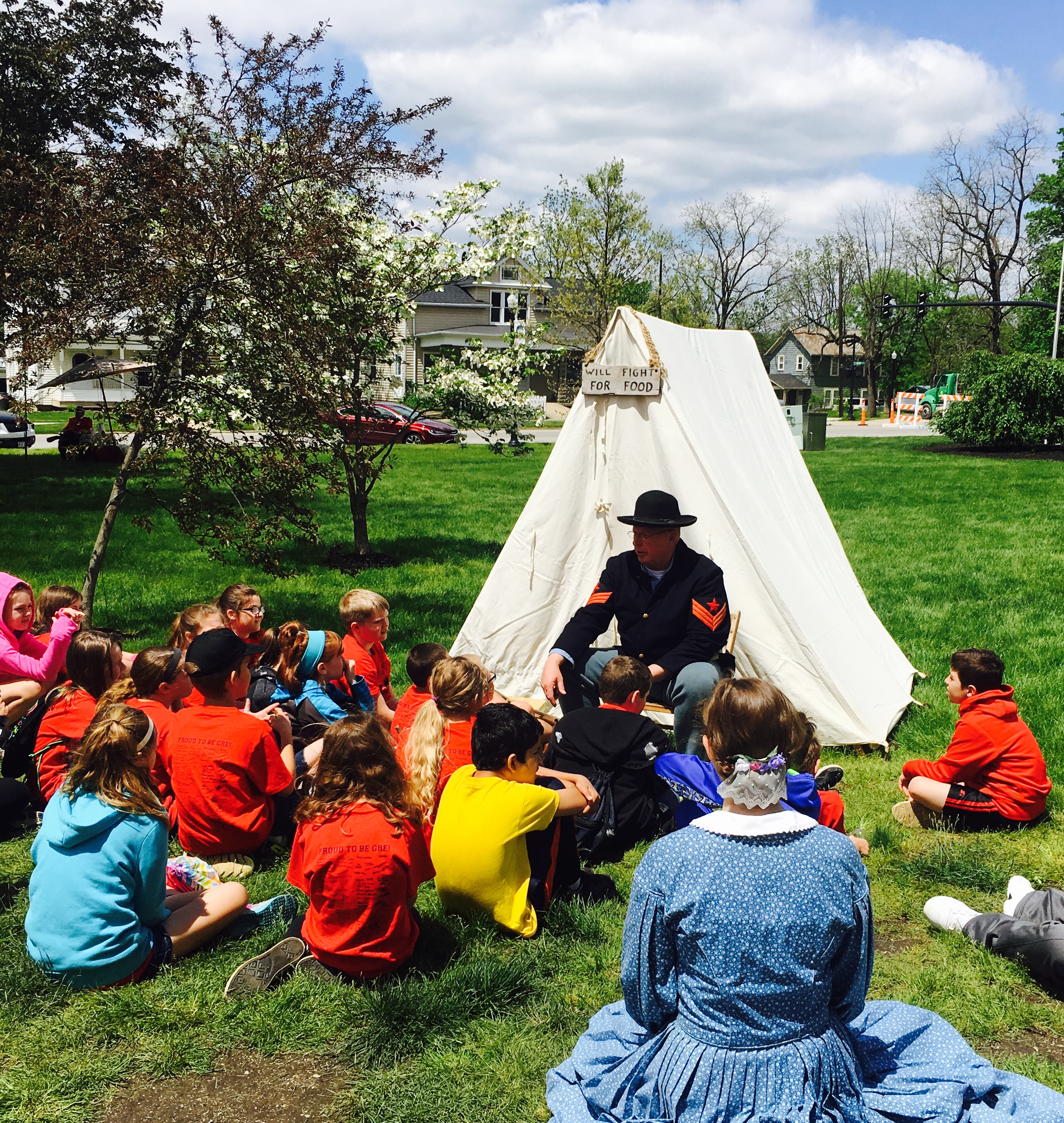 program was repeated in the afternoon. Once again Rick Helwig organized the event for the Big Walnut Area Historical Society. Damon Bower found the volunteers to dress in costume and lead the groups through the stations. Alice Chapan and her team of Connie Ackerman and Carol Wood provided food for the 24 event workers. |