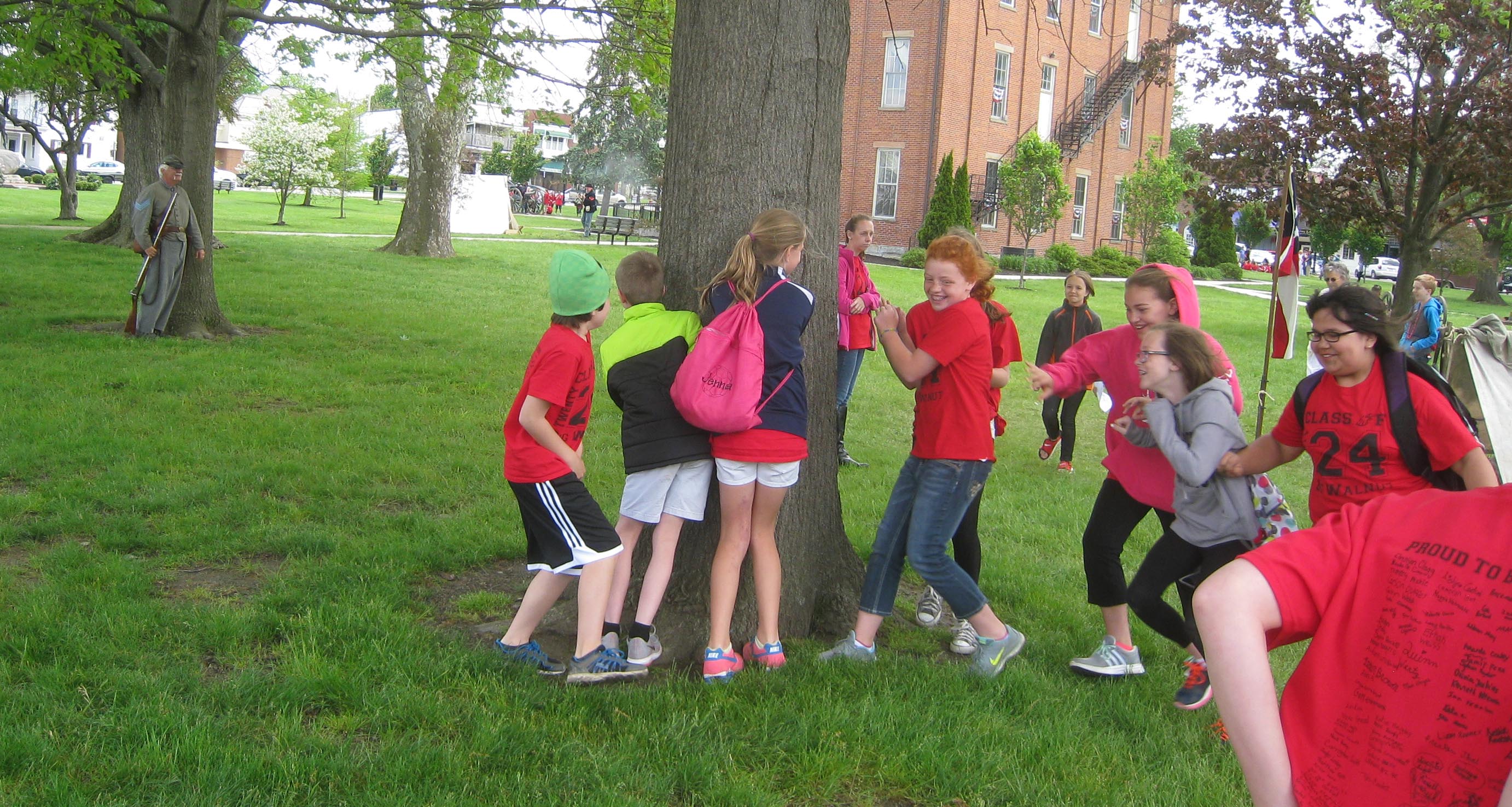 Rebel Soldier behind tree to left and Students hide to avoid the Yankee blanks fired their way. |