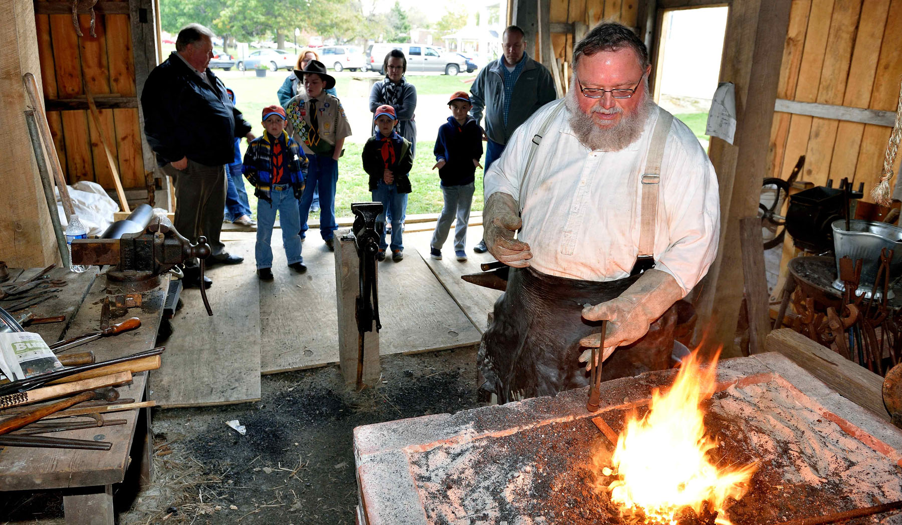 Blacksmith Rick Helwig Demonstrates molding iron using a forge in the Myers Inn Barn |