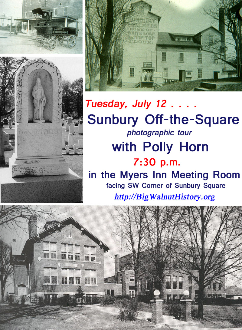 Sunbury Off-the-Square with Polly Horn Not everything happens around the square in Sunbury. Just a block away in any direction there have been many changes over the 200 years of Sunbury’s history. Using old photographs from The Sunbury News, local photographers and others people have allowed Horn to scan, we can watch the community grow. Horn’s family owned The Sunbury News from 1915 until 1994 and many of the photos went through her hands for scanning and preservation. Use this opportunity to learn the story behind things you see everyday and probaly never questioned. Where do highways 3-CCC, 47, 61 and 30 meet? Why do houses sit up on the hill on SR 37? Where were gas wells in Sunbury? What did Nestles originally make in Sunbury? Why do you get water in your basement? See prize winning sculpture and quaint barns Learn more Tuesday, July 12. |