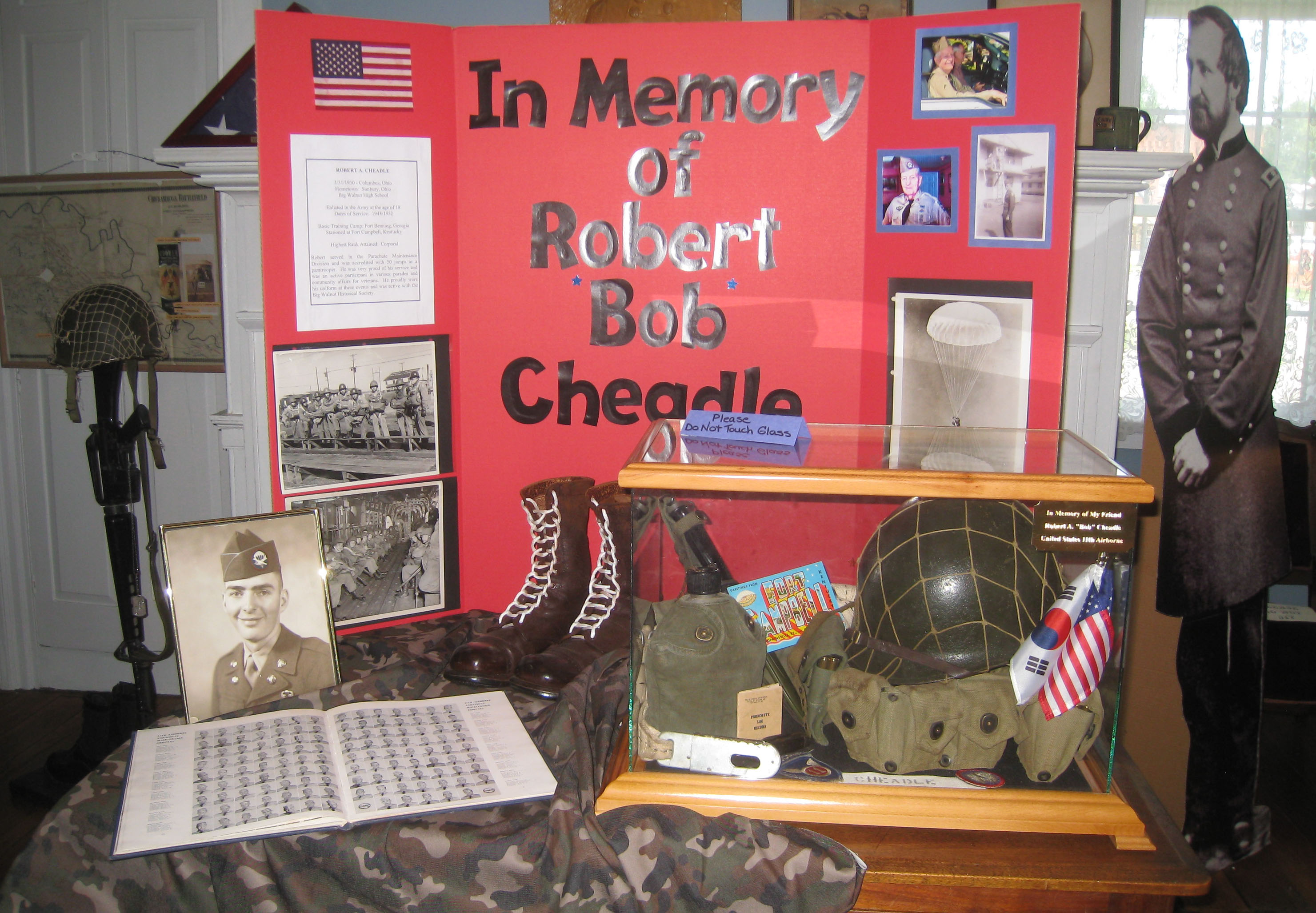 The Exhibit of military uniforms and artifacts of local veterans which opened May 25th at the Myers Inn Museum is in honor of longtime Big Walnut Area Historical Society Board of Trustee member, the late Bob Cheadle. It was put together by Sue and Bill Comisford. |