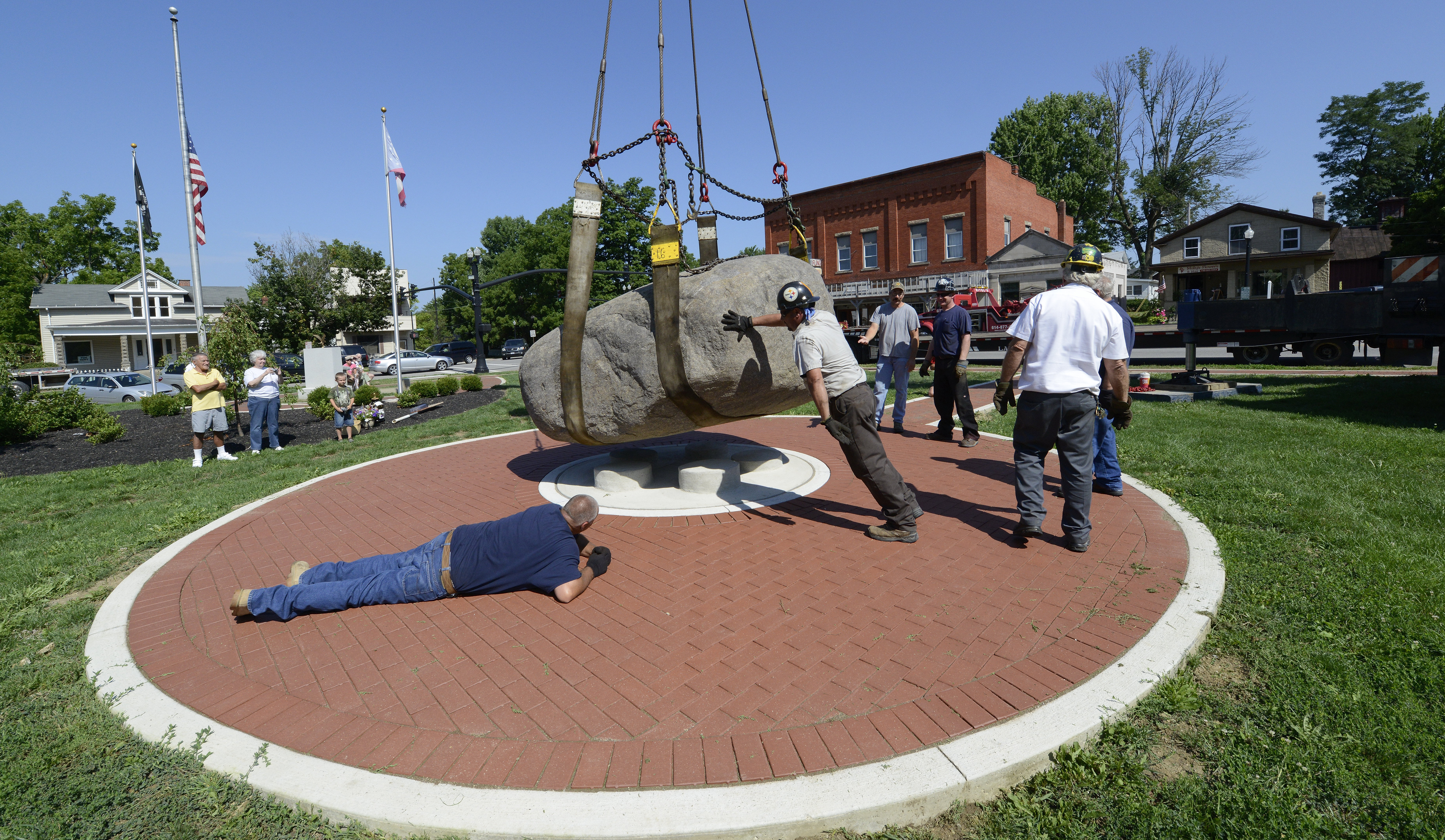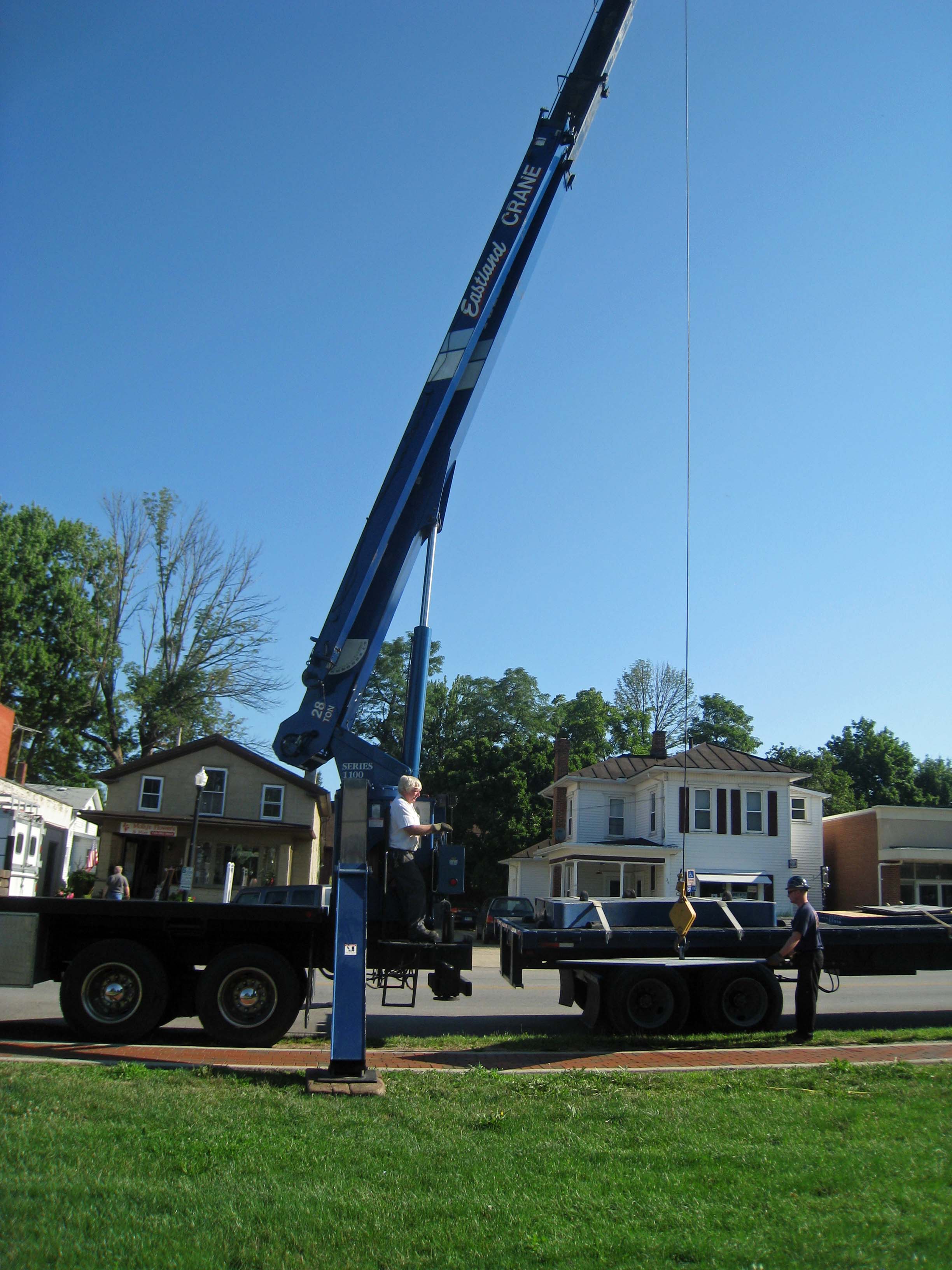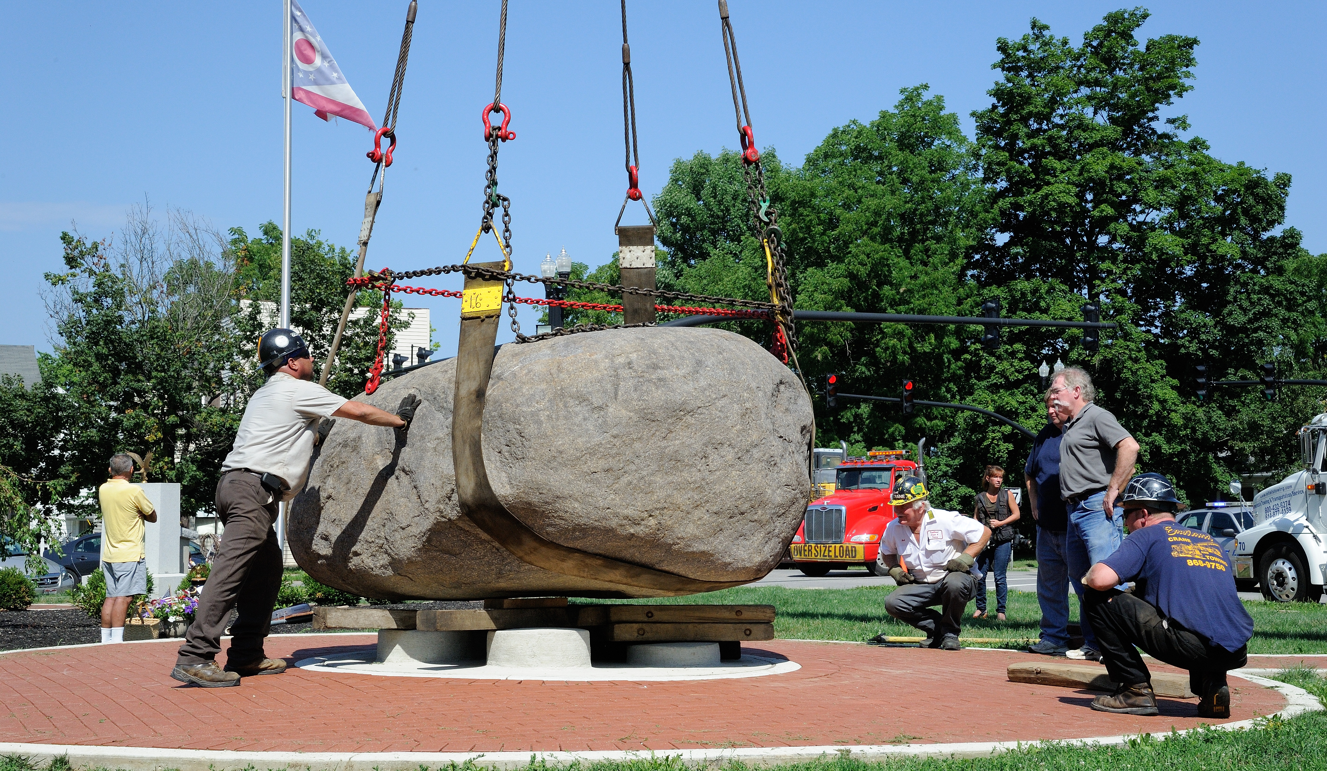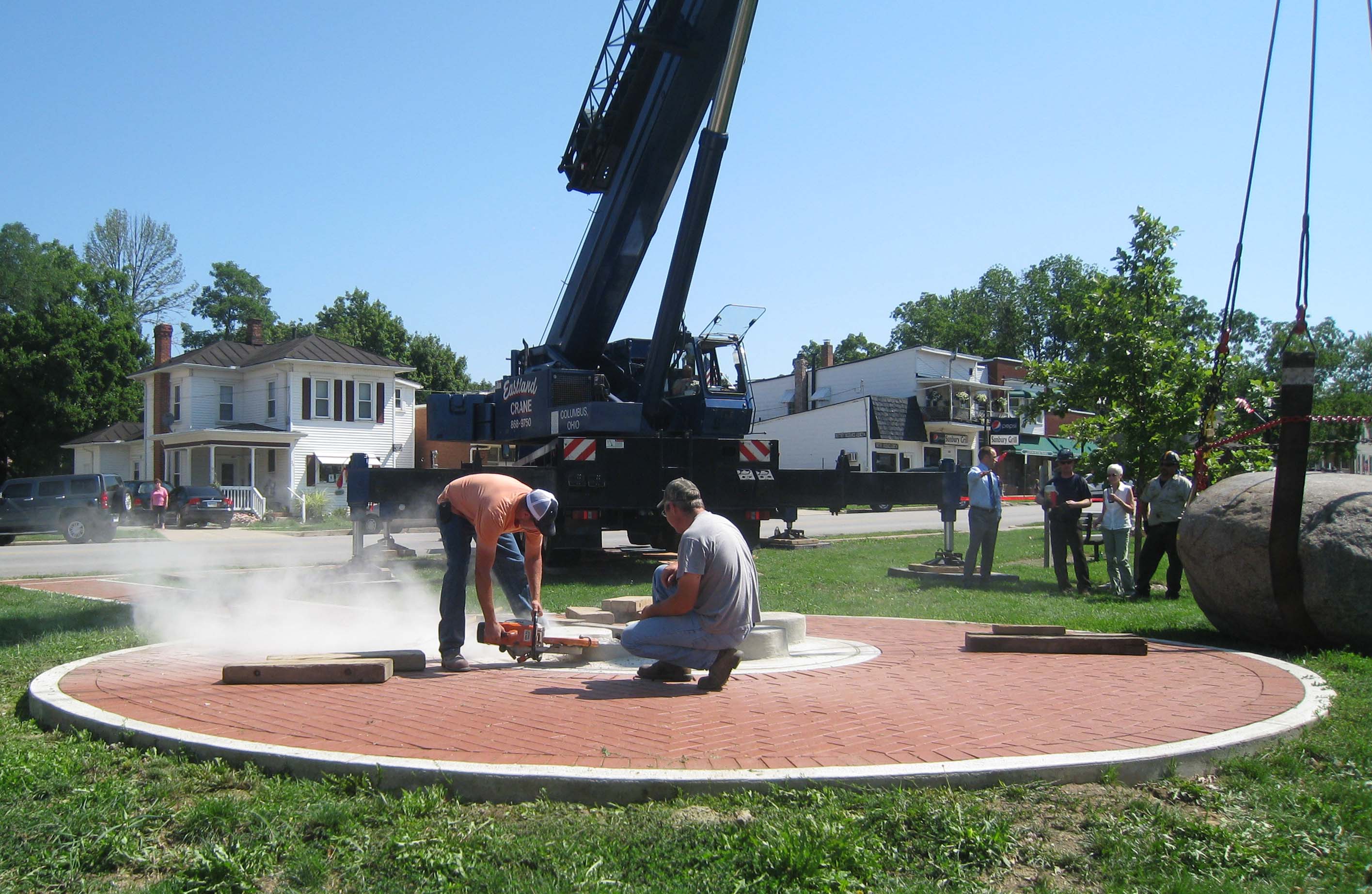 Many thanks to Stacy Wills owner of Eitels Towing, Bob Marshall owner of Eastland Crane, Doug Spangler  of Cellar Lumber, Matt and T. J. Hoover  and the Sunbury Village Police force for getting the boulder settled on its new platform. Thanks to Bill Comisford, Henry Shaw, Damon Bower, Janet MacKenzie, Alice Chapan, and Lenny Lepola for doing their part to make this day a success.
