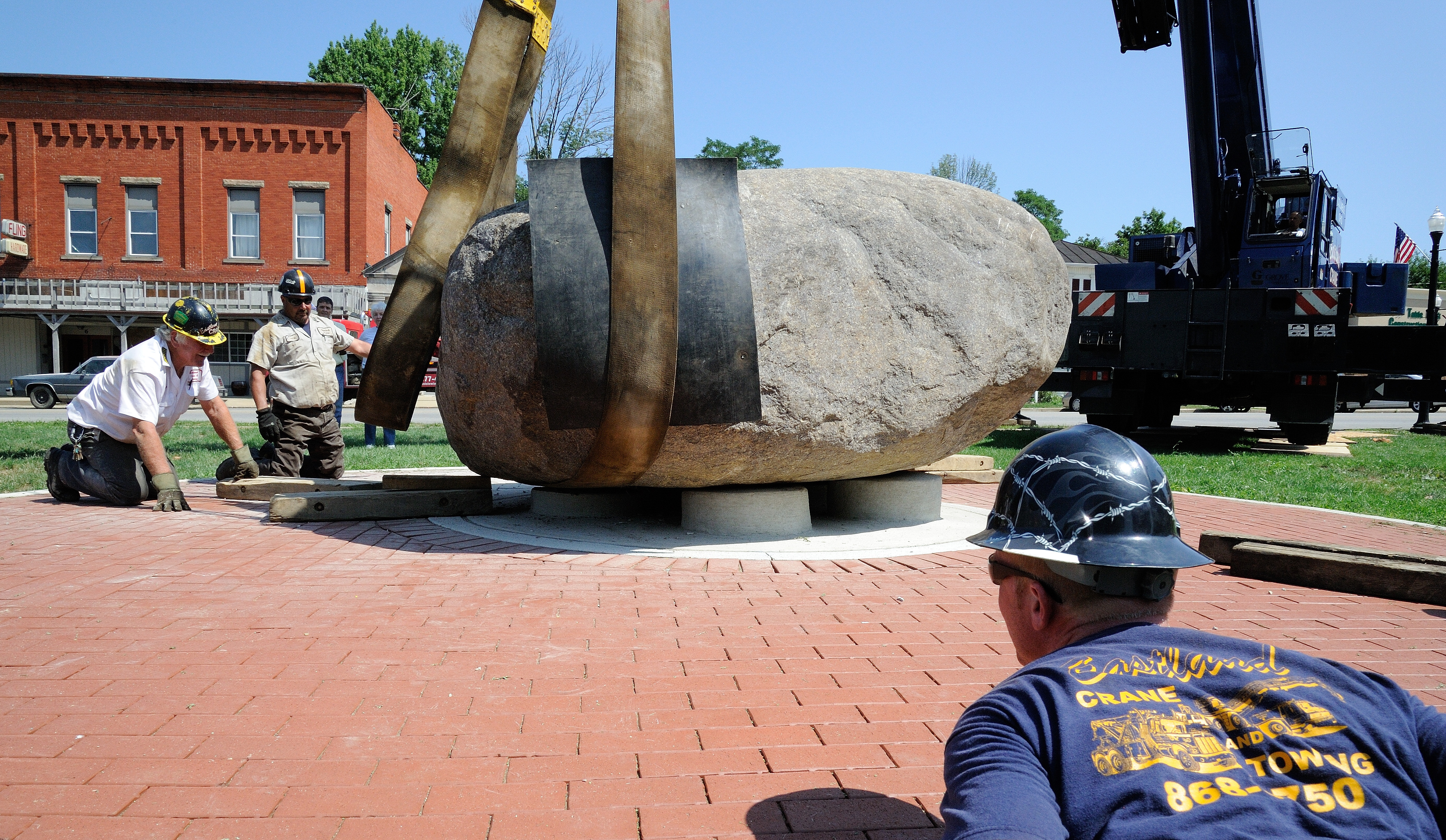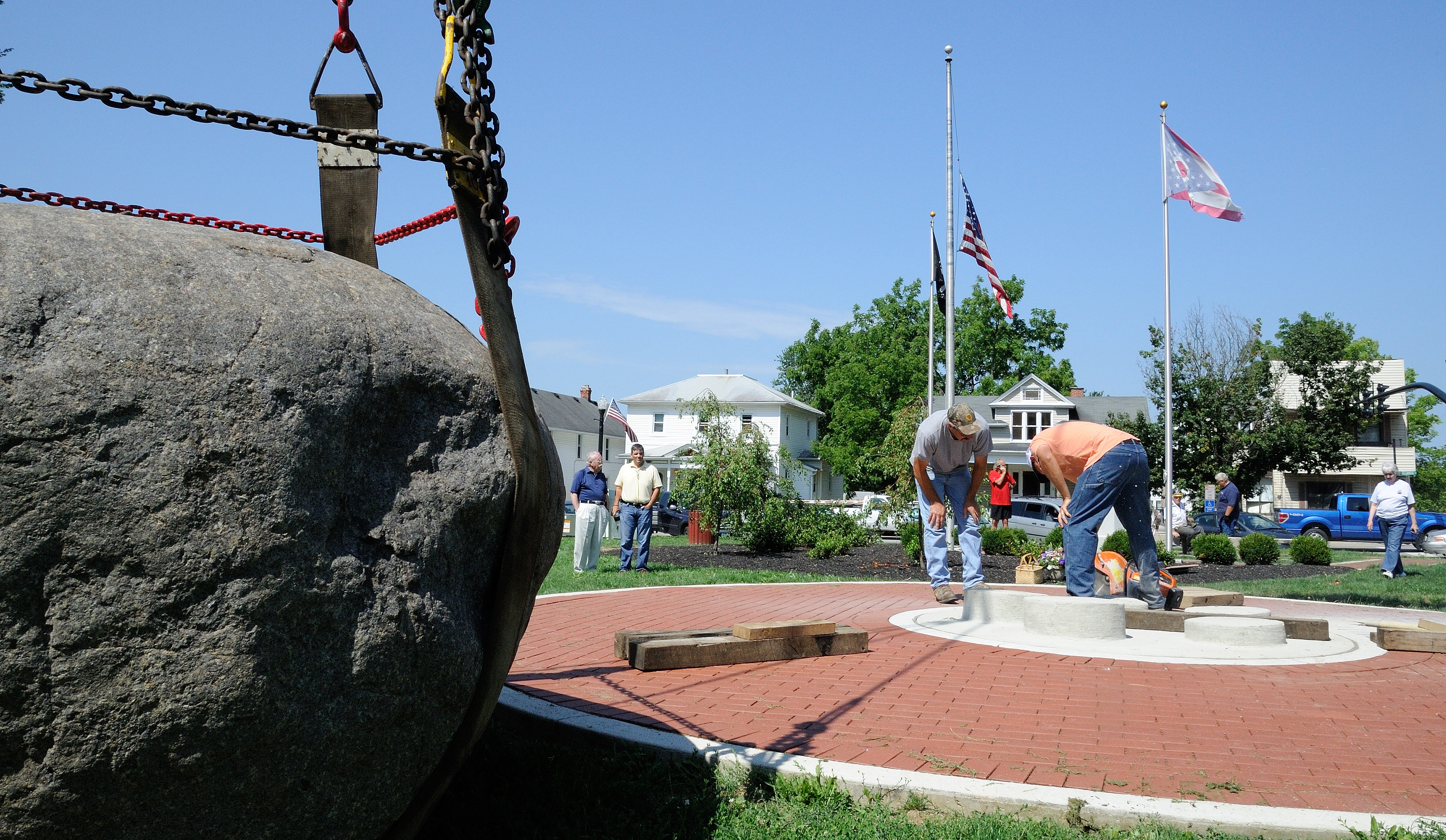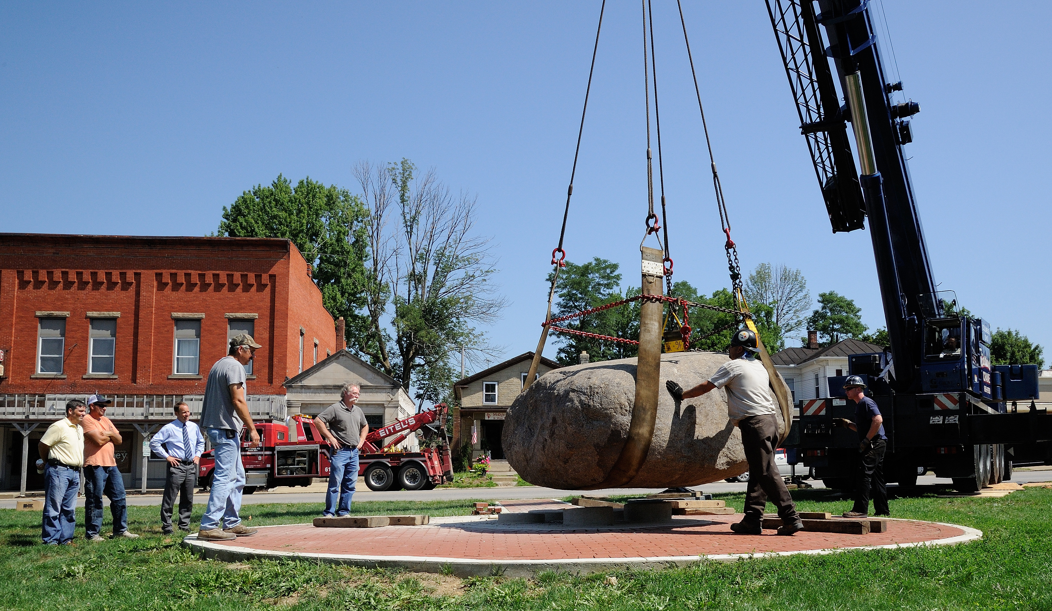 Many thanks to Stacy Wills owner of Eitels Towing, Bob Marshall owner of Eastland Crane, Doug Spangler  of Cellar Lumber, Matt and T. J. Hoover  and the Sunbury Village Police force for getting the boulder settled on its new platform. Thanks to Bill Comisford, Henry Shaw, Damon Bower, Janet MacKenzie, Alice Chapan, and Lenny Lepola for doing their part to make this day a success.