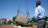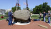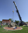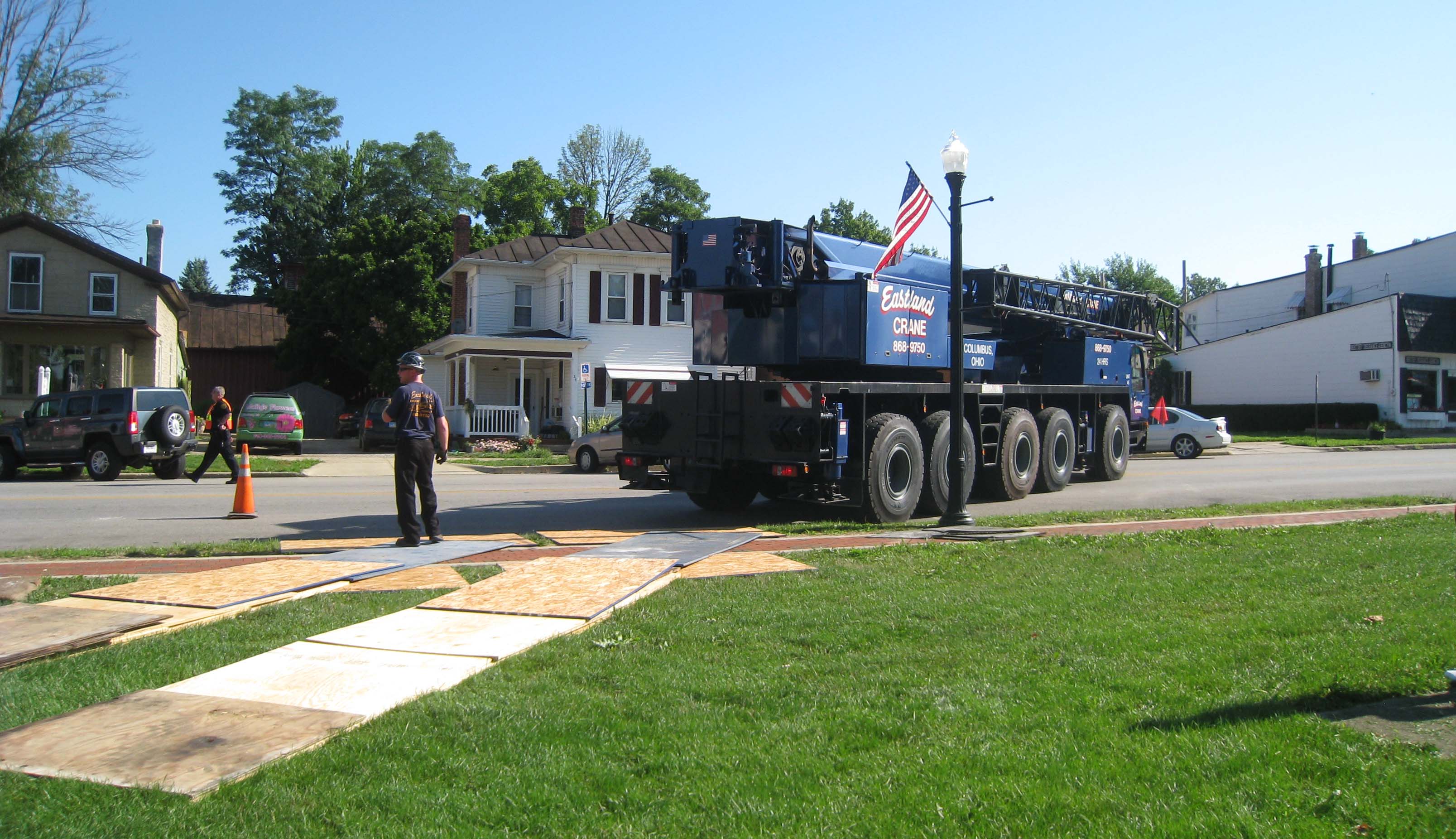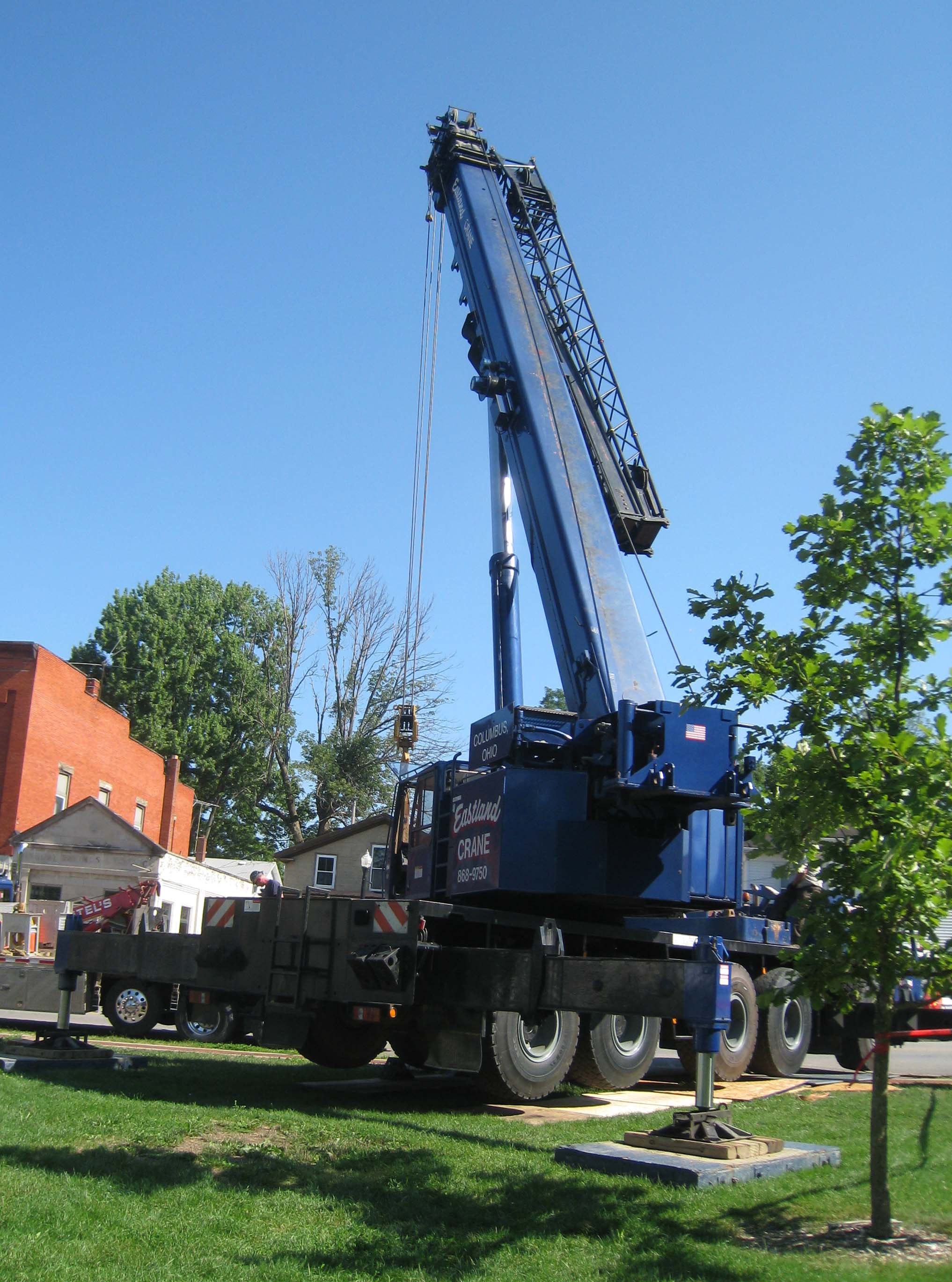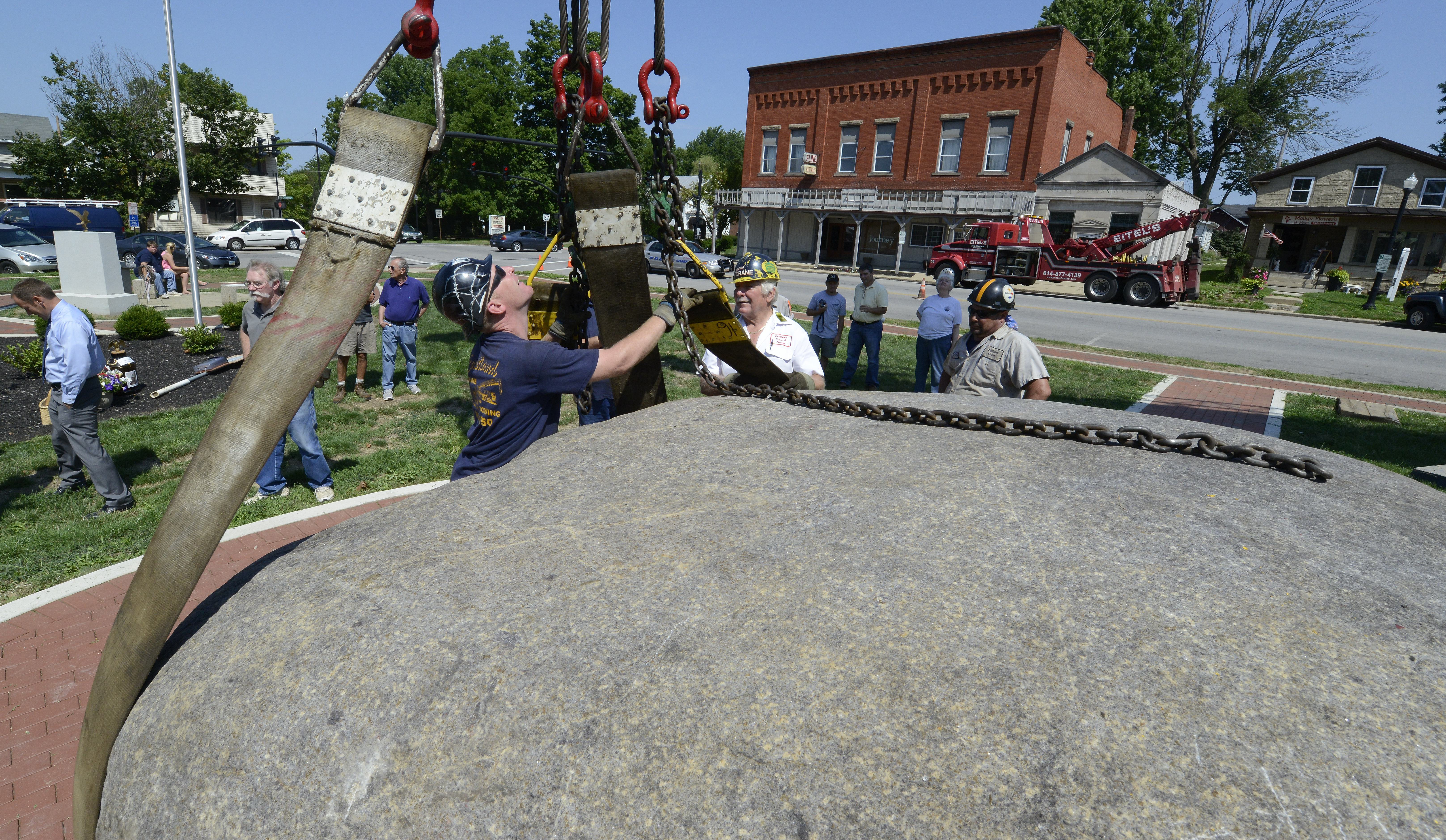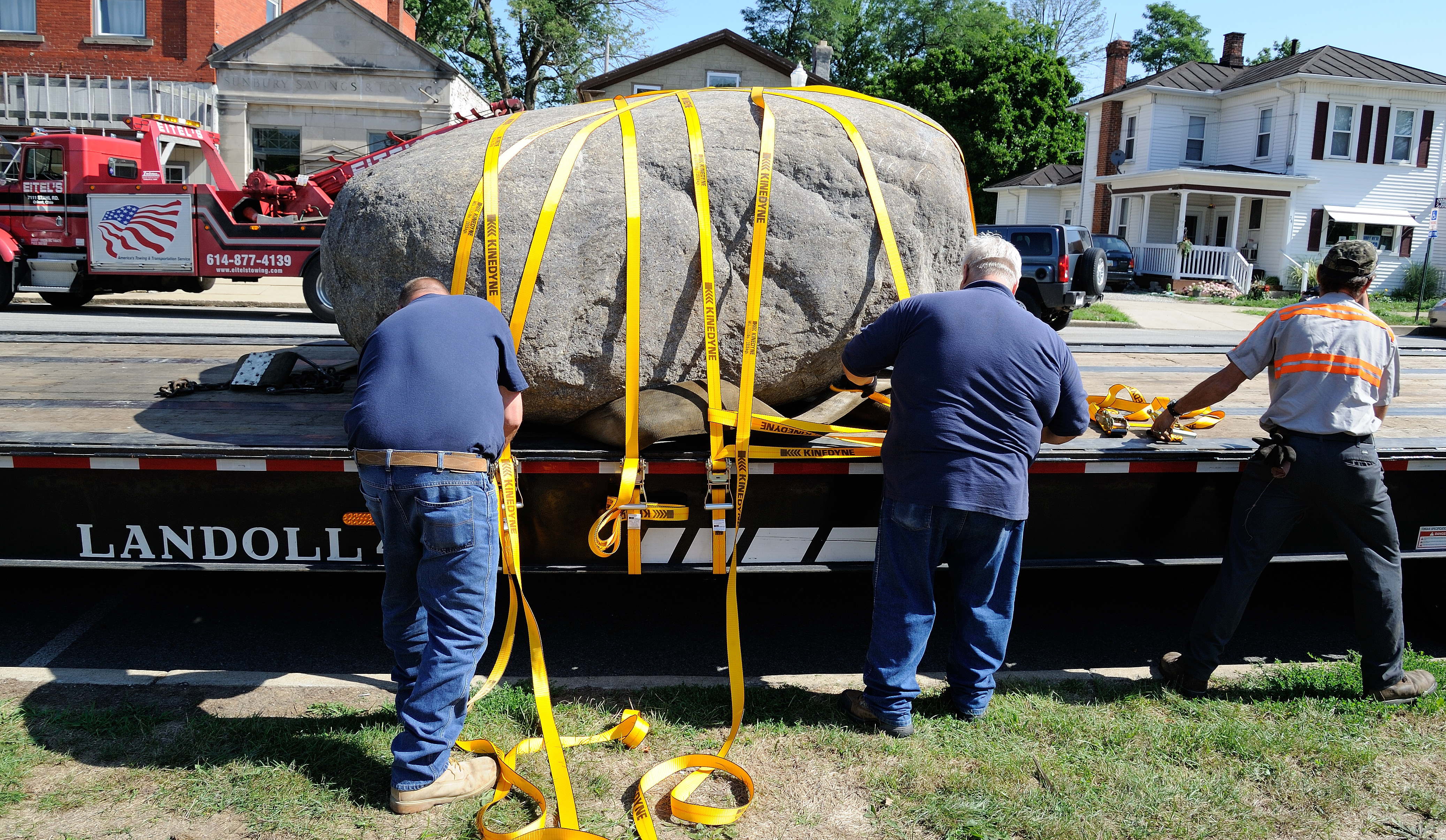 Many thanks to Stacy Wills owner of Eitels Towing, Bob Marshall owner of Eastland Crane, Doug Spangler  of Cellar Lumber, Matt and T. J. Hoover  and the Sunbury Village Police force for getting the boulder settled on its new platform. Thanks to Bill Comisford, Henry Shaw, Damon Bower, Janet MacKenzie, Alice Chapan, and Lenny Lepola for doing their part to make this day a success.