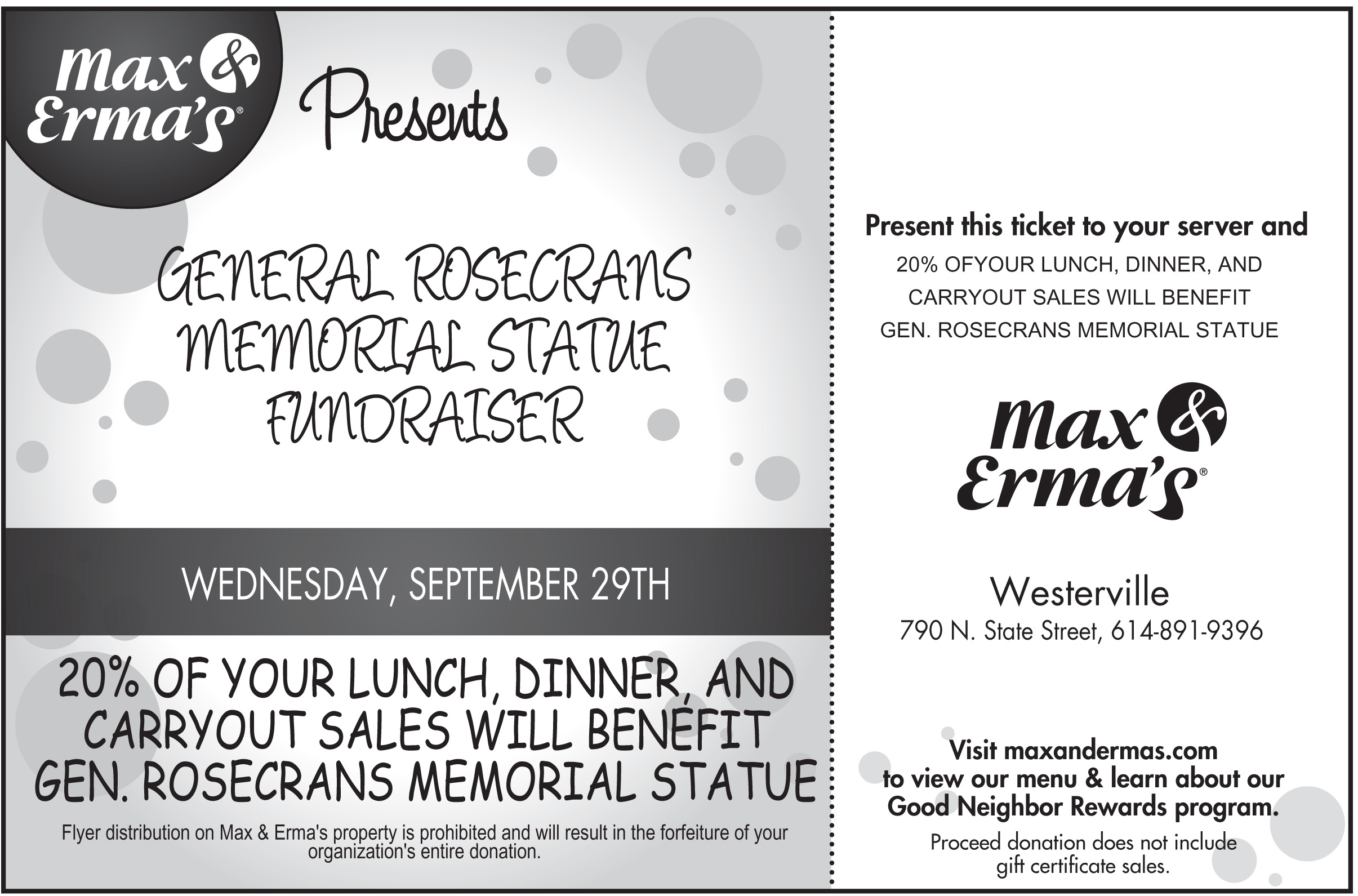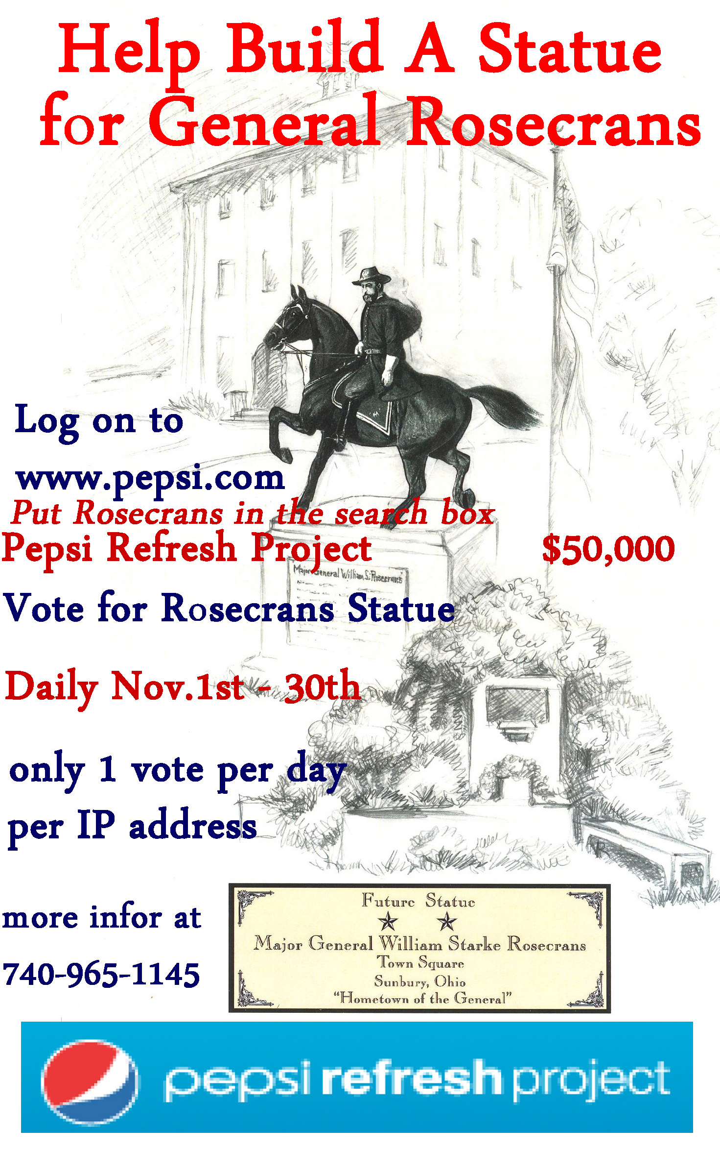 Conceived by the Rosecrans Command Headquarters to honor Kingston Township native, funds and in-kind donations were raised locally to commission Sculptor Alan Cottrill to make this equestrian Statue of the General and his horse Bony (after Boneparte) which was dedicated Saturday, September 28, 2013. |